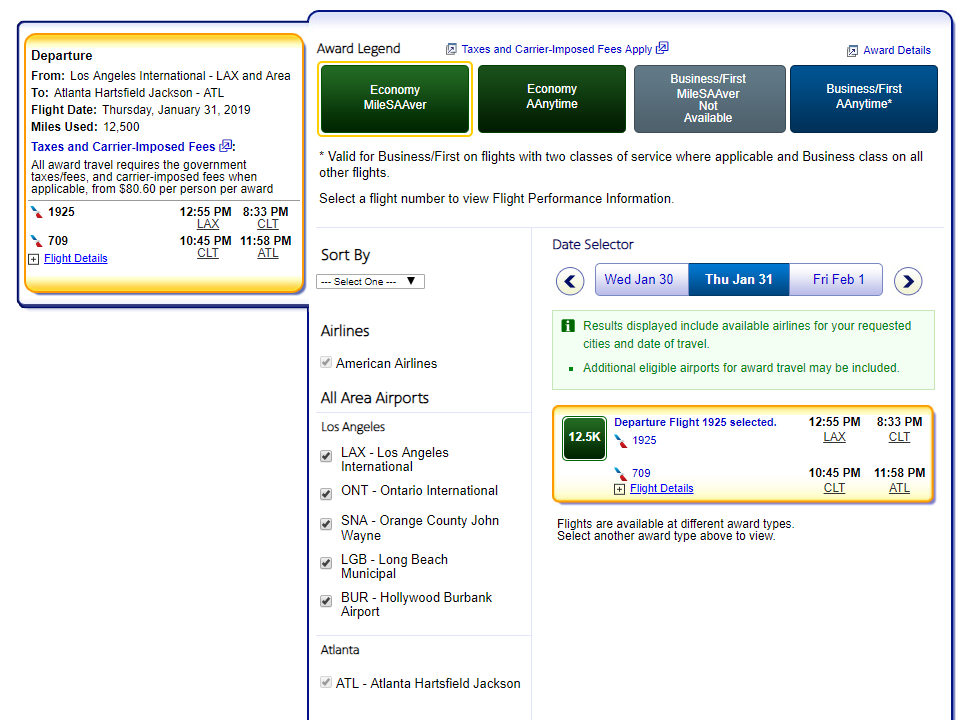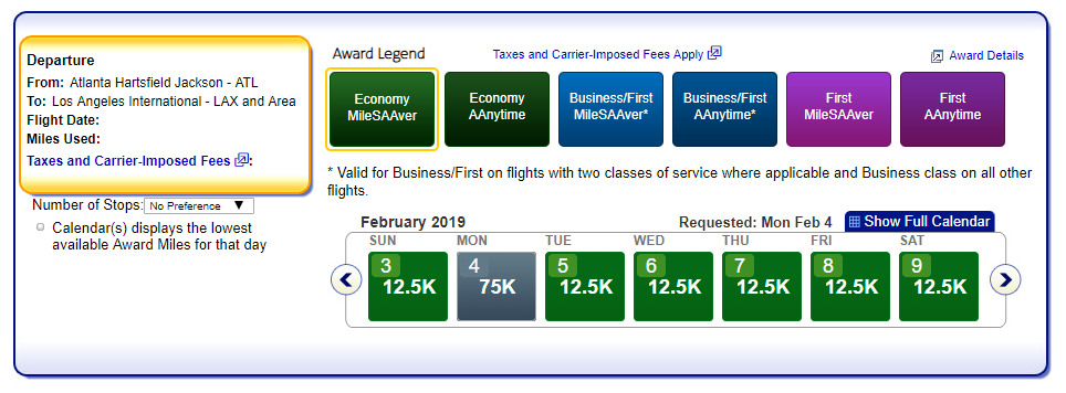 The Monday return with American on the other hand is pretty ugly, with all flights requiring 75,000 miles for an economy seat. However, if you fly back any other day the next week, it costs just 12,500 miles: