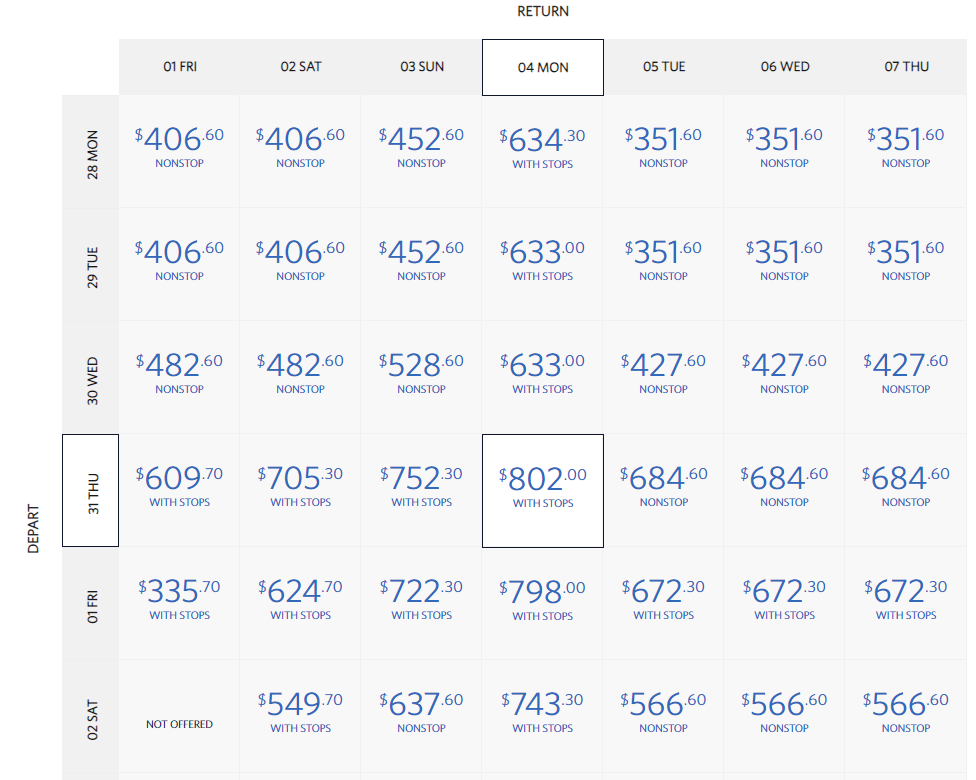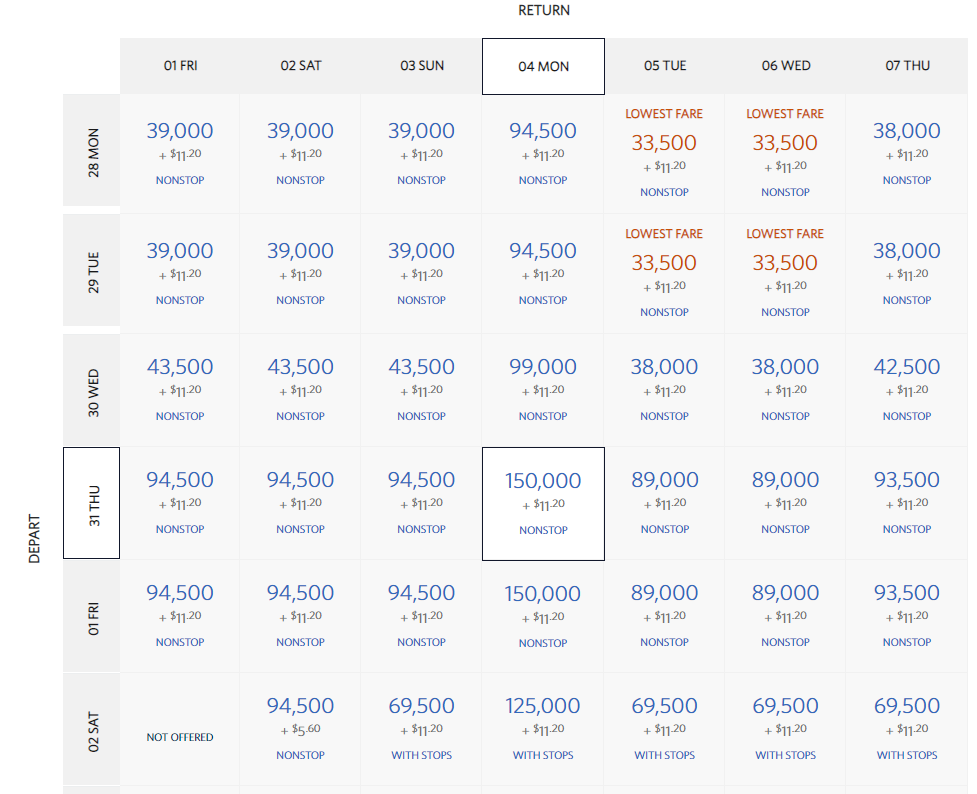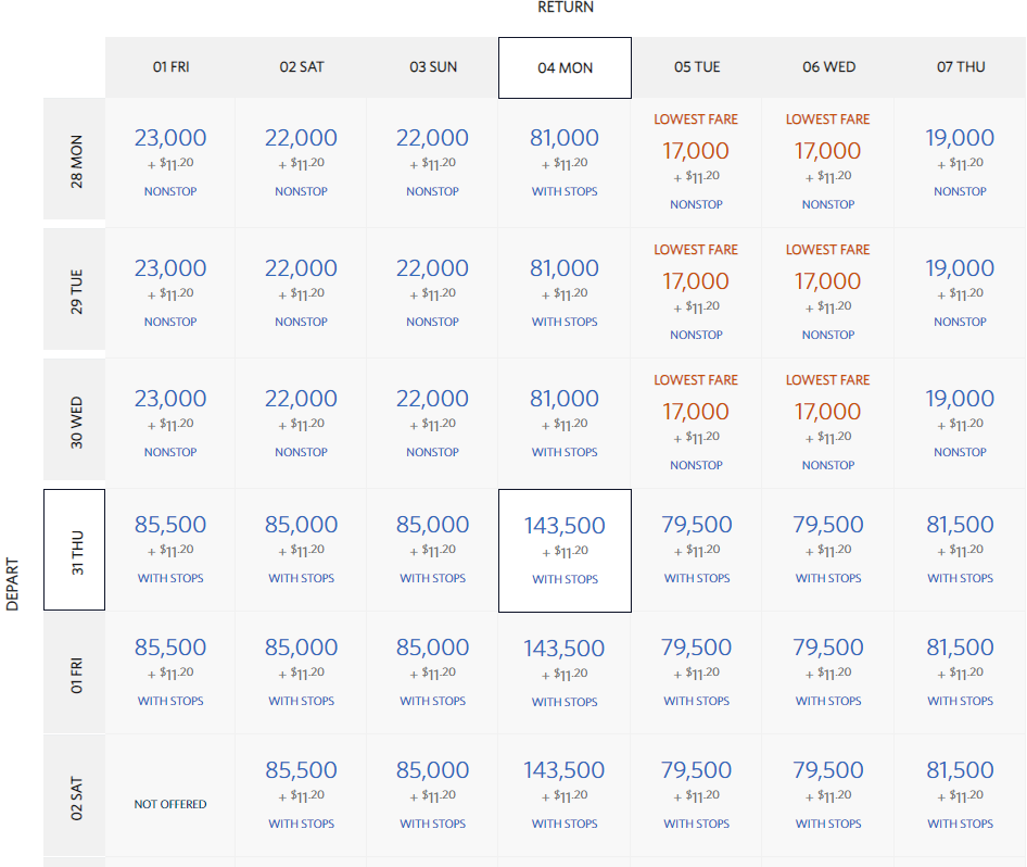 The perfect travel dates of Thursday to Monday will run you an astounding 150,000 SkyMiles for the cheapest ticket. Changing your travel dates by a couple days could save you as much 61,000 SkyMiles if you can come back on Tuesday instead of Monday. Cash fares on Delta aren't any better with $802 required for a Thursday departure and a Monday return: