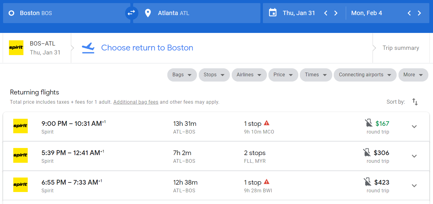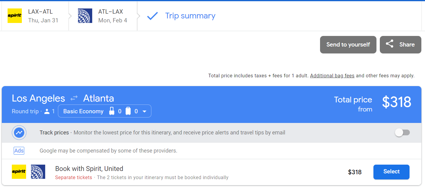 If you're looking for the cheapest option, you can fly ultra-low cost carrier Spirit from LA to Atlanta nonstop for $169 on Thursday. Then book a United basic economy nonstop flight departing at 12:45am Monday for $149. Combined, that's just $318 round-trip before factoring in costs for a carry-on bag, checked bag or seat selection: