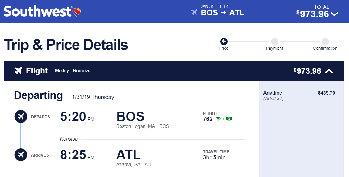 Flights from Boston to Atlanta on Southwest are pricing at $974 round-trip for that weekend, but at least the options are nonstop. And that could be the best deal out there if you have the Companion Pass and are bringing along a friend or family member.