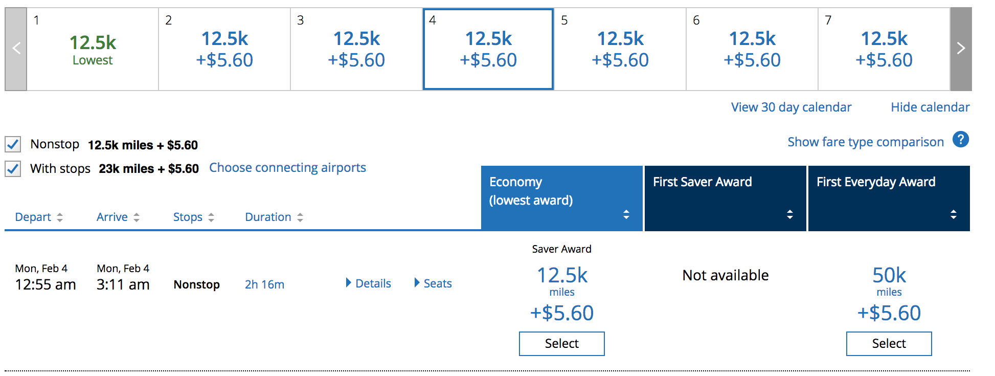 Moving across the other legacy carriers, United has round-trip award tickets available for 32,500 miles if you are a Chase co-branded cardholder and can access XN fare availability. The outbound is one-stop with a red-eye but the Monday return is nonstop after the game has ended: