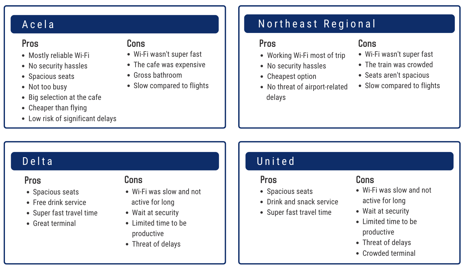 Amtrak Regional: Hannah whizzed by Newark, hard at work typing on her laptop. There was a plug right next to her tray table, making it easy to work on the go. She was happy to be on the ground where Wi-Fi was available for the entire trip, and she didn't have to pack up her laptop to run between security checkpoints and boarding gates.