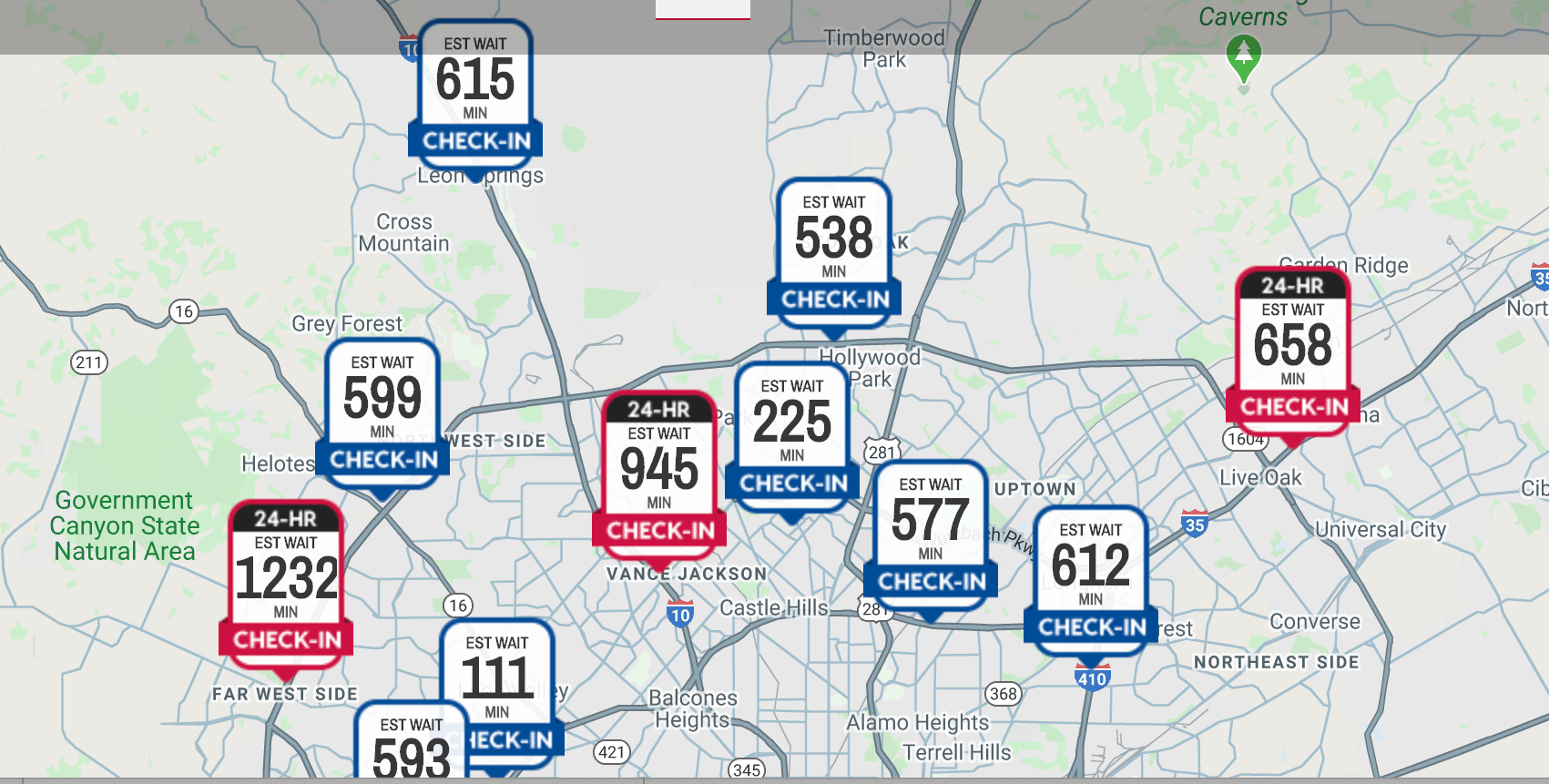 To give you an accurate picture of what was happening as Texas was experiencing a case and testing surge, here were June posted waits at some urgent care centers in Texas, which were some of the easiest places to get tested.