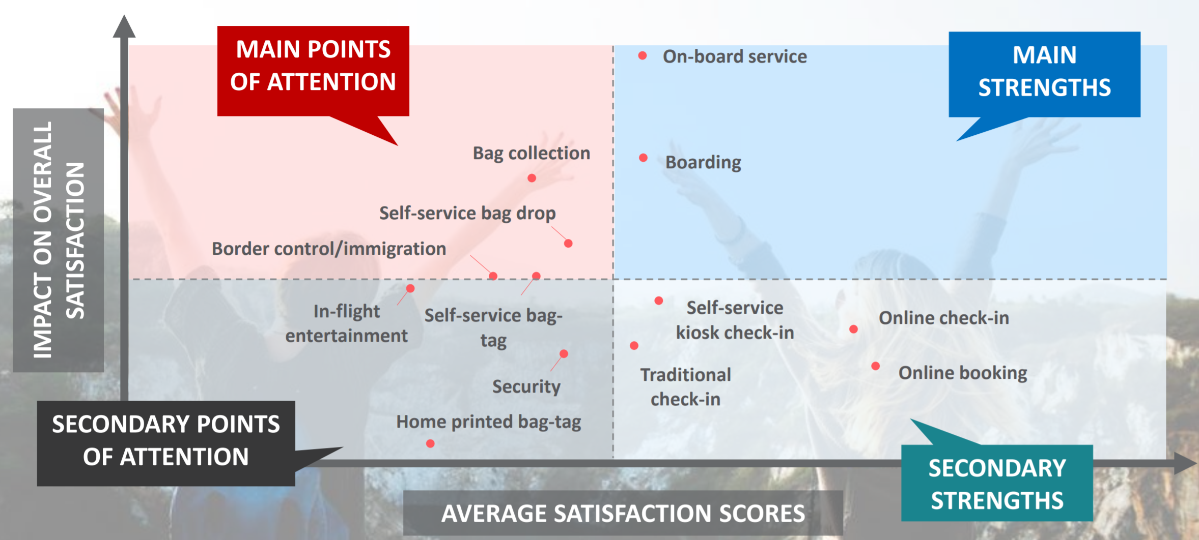The survey also quizzed respondents on how airlines are doing across various aspects of the travel experience and how important these aspects are to the traveler. On-board service was found to be the most influential aspect of overall satisfaction, and travelers are only barely satisfied with the current state of affairs.