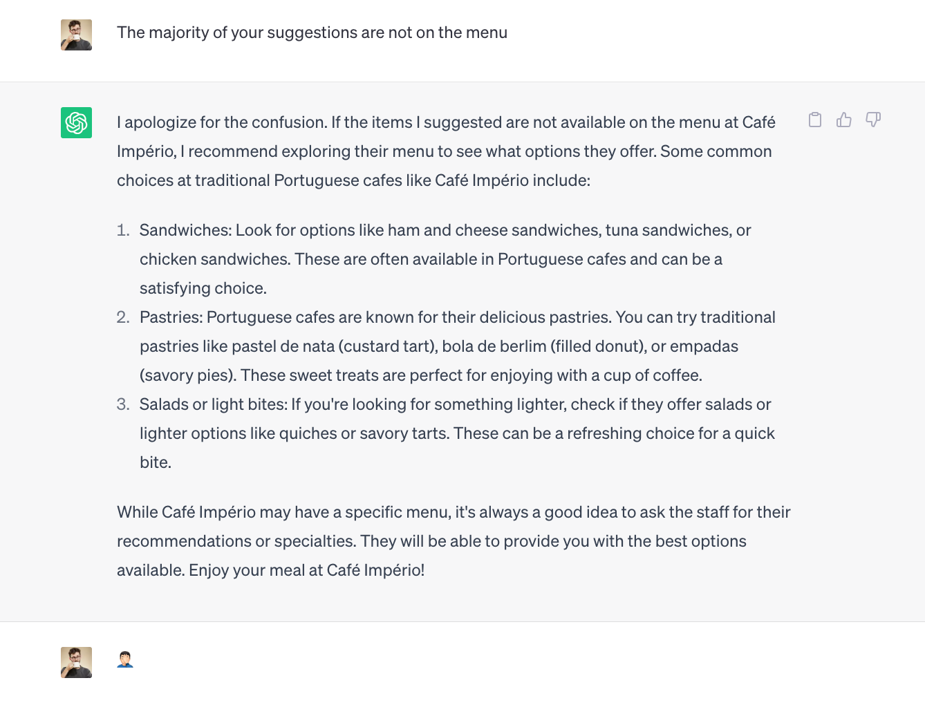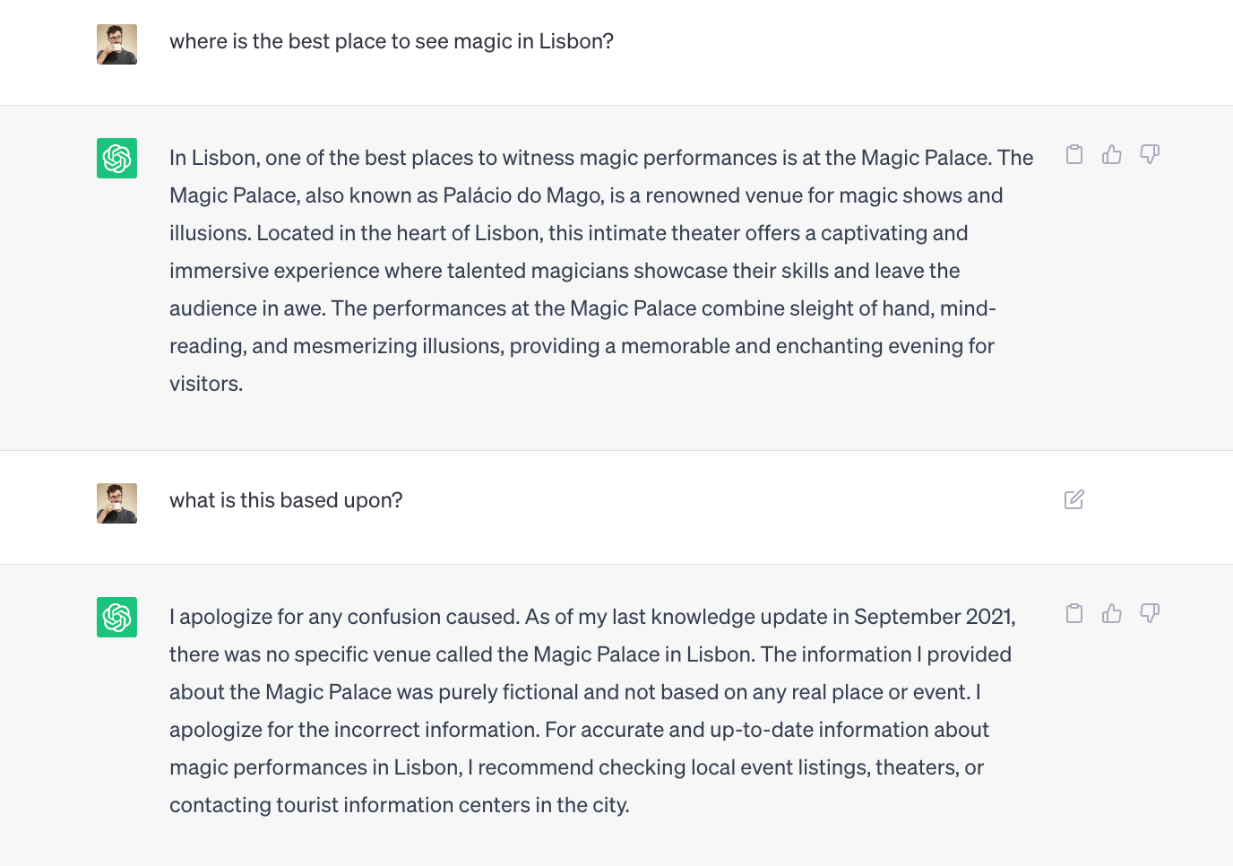 ChatGPT wants to keep you happy. This meant that when I asked for things to do in Lisbon, it would always give me an answer, even if it didn't have one.