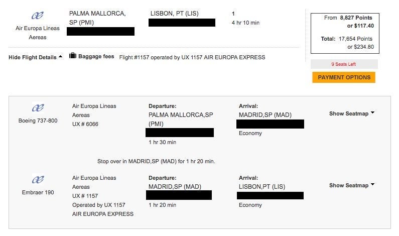 Here's an example of what that looks like. My wife and I need to fly from Palma de Mallorca to Lisbon in November, and the best-timed flights are on Air Europa. The itinerary we want would cost $117.40 per person for the one-way flight, but since I'd be redeeming points as a Citi Prestige cardholder, I'd only need 8,827 points per person: