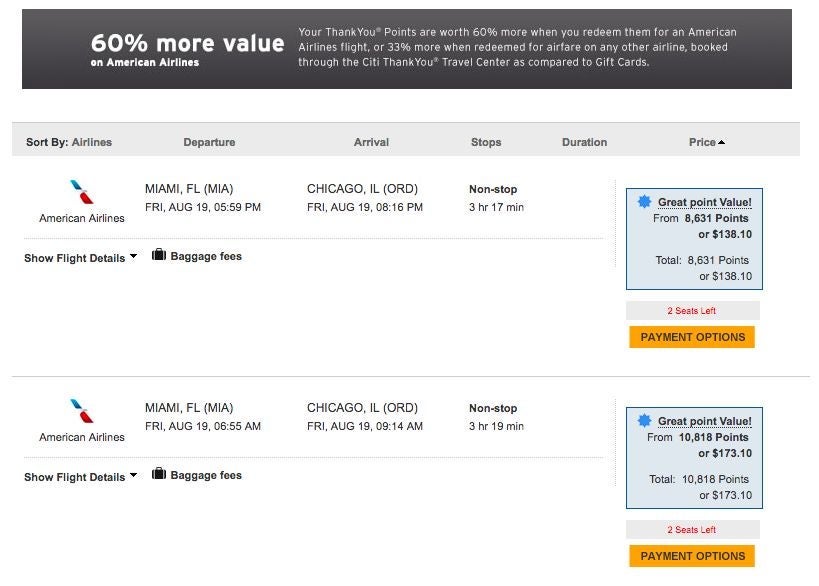 You can get even more value by redeeming your points directly for flights on American. Here's an example for a one-way itinerary from Miami (MIA) to Chicago-O'Hare (ORD) on Friday, August 19: