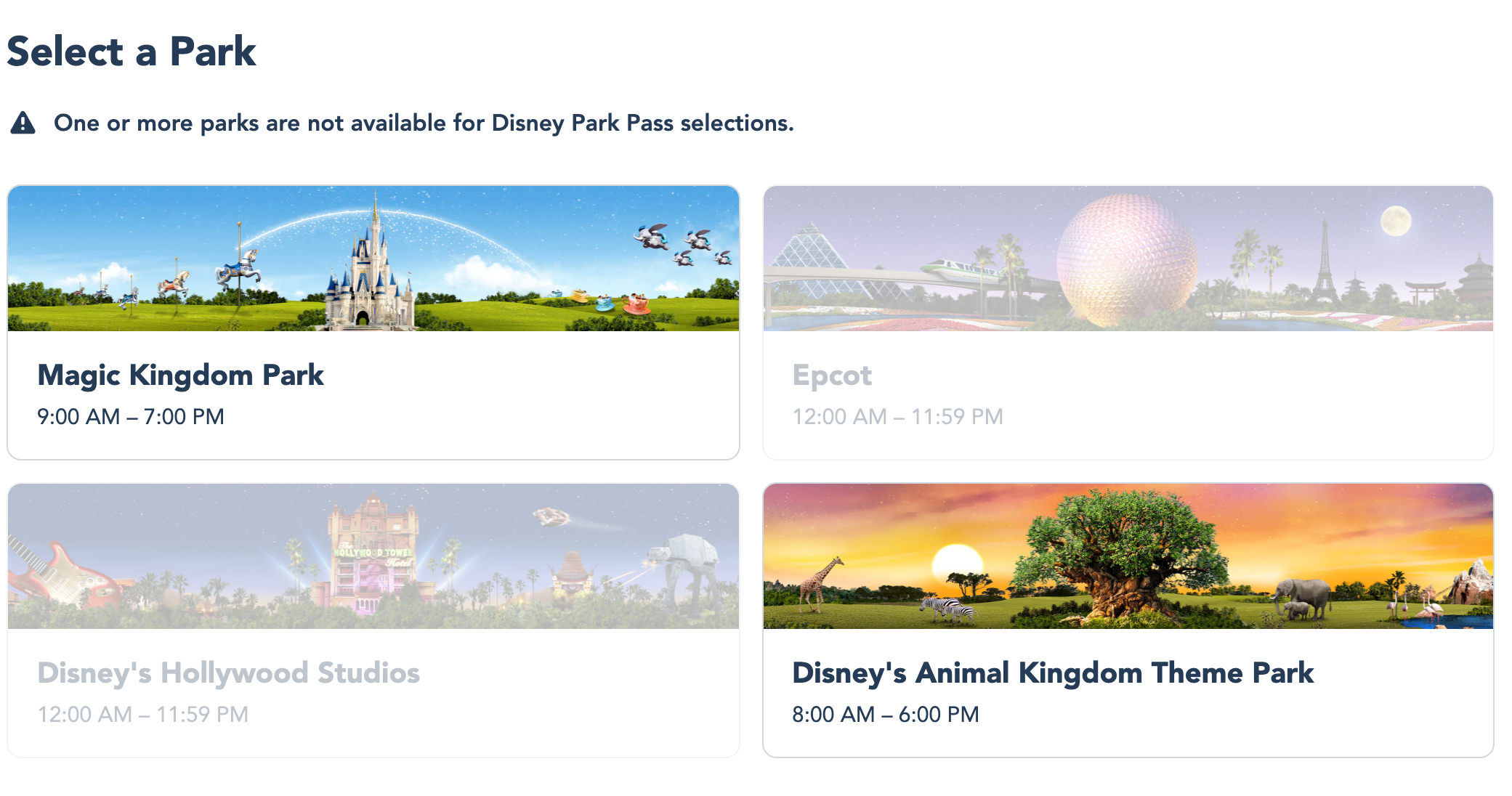 You can only select one park per day, but park hopping from that originally visited park is available on a space-permitting basis each day at 2 p.m. Additionally, pricey private VIP tours accommodate for visiting multiple parks in one day. You can also only make a maximum of three park day bookings at a time if you have an annual pass but don't have a Disney resort stay attached to your account.