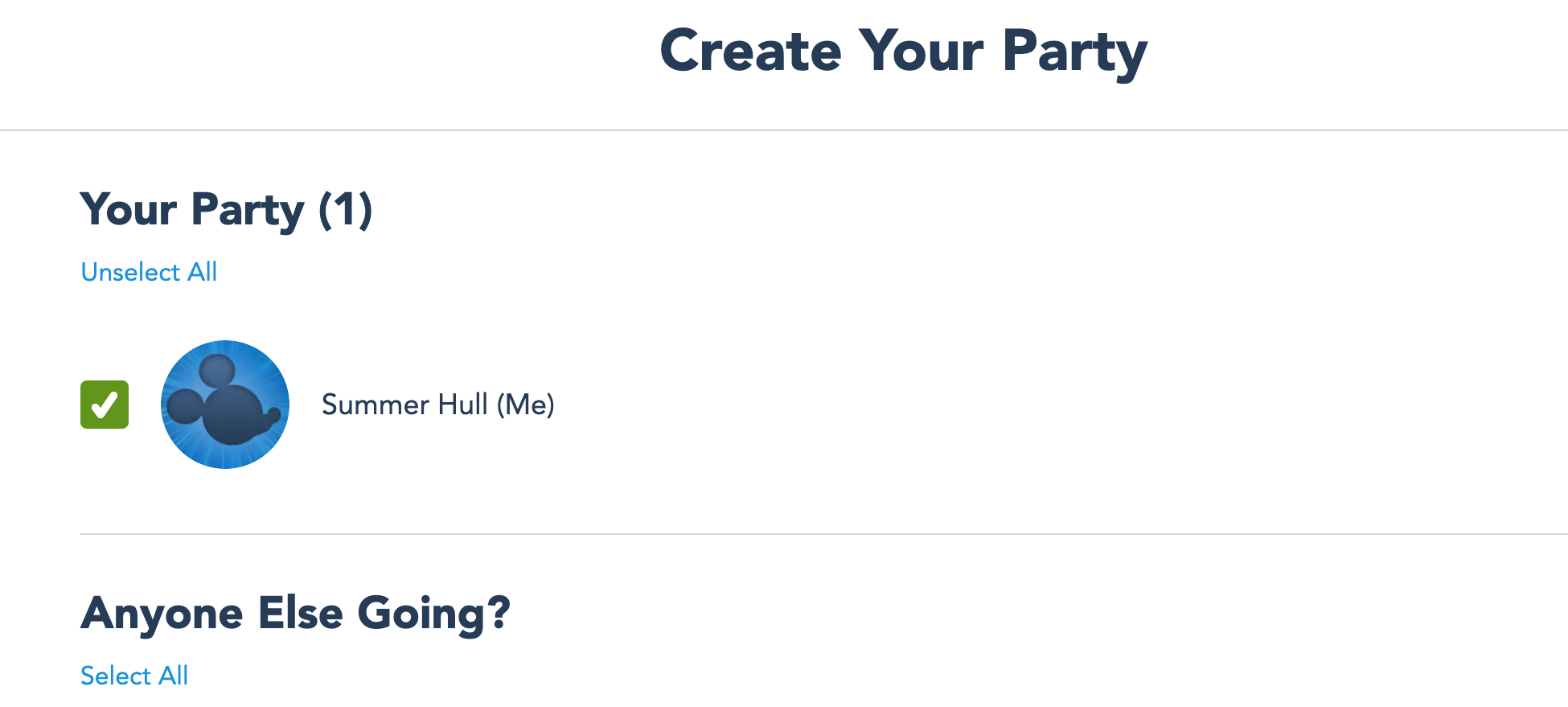 You'll then need to select your party that you wish to enter the park with on a given date. Remember, everyone you select is going to need a valid park ticket or Disney annual pass attached to their name. The only exception is for those who are under 3 years old that do not need a ticket or Park Pass reservation to enter Disney World.