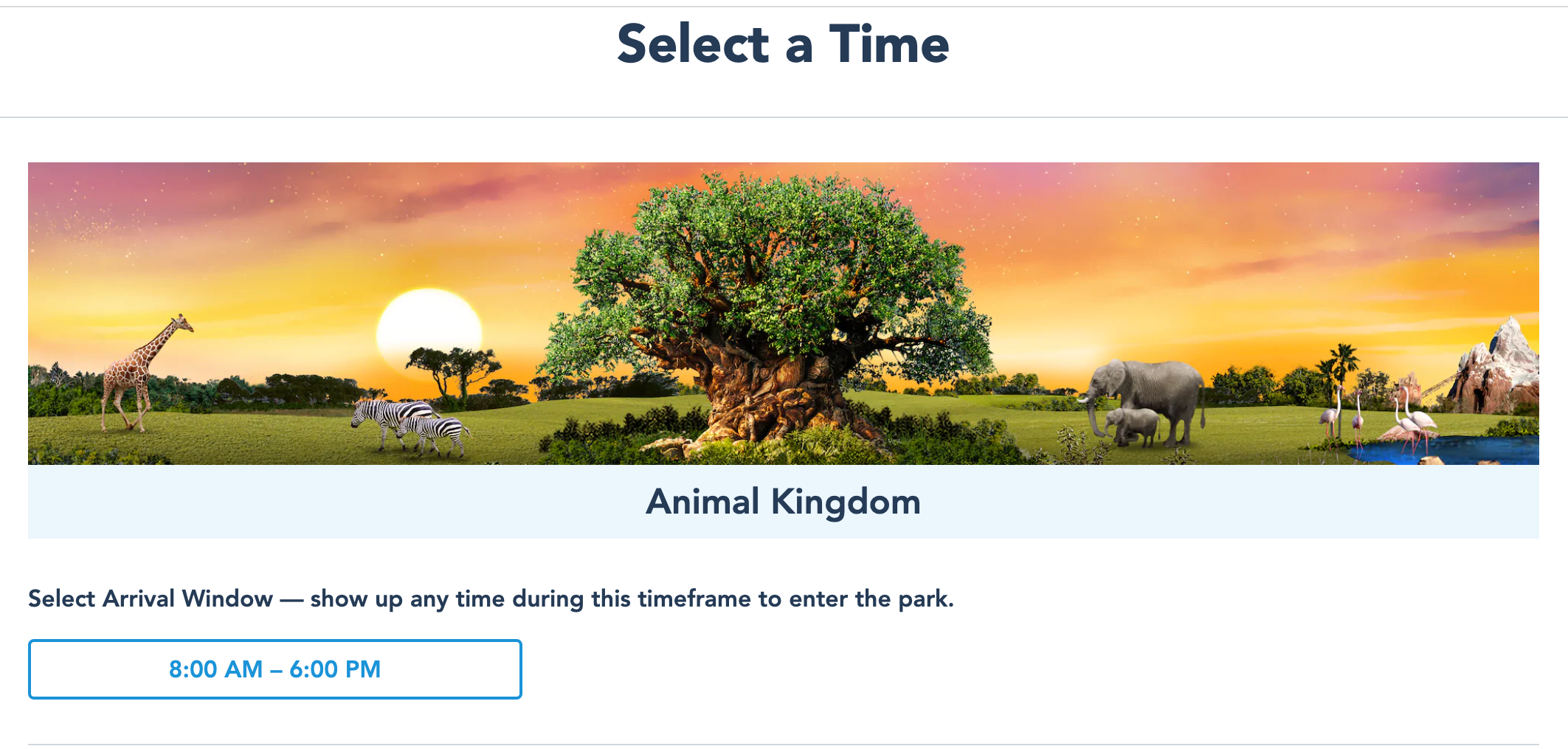 Once you select your park, you'll see a screen that asks you to select your entry time. Perhaps in the future, this will be used to select a specific time to enter the park but, for now, the only options we see are for the full day.