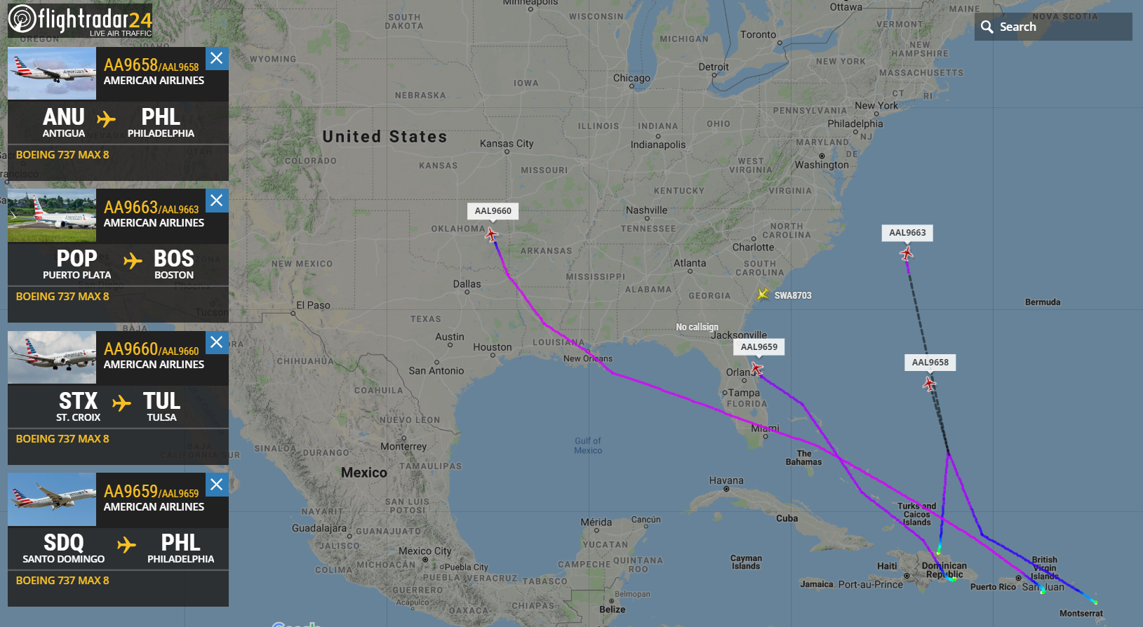 22 of the 24 grounded 737 MAX in AA's fleet are being repositioned for temporary storage. American Airlines has confirmed that these flights will only have flight crew on-board -- no passengers or flight attendants. The flights will operate with a 96XX flight number. Four of these flights were in the air at 3:30pm ET: