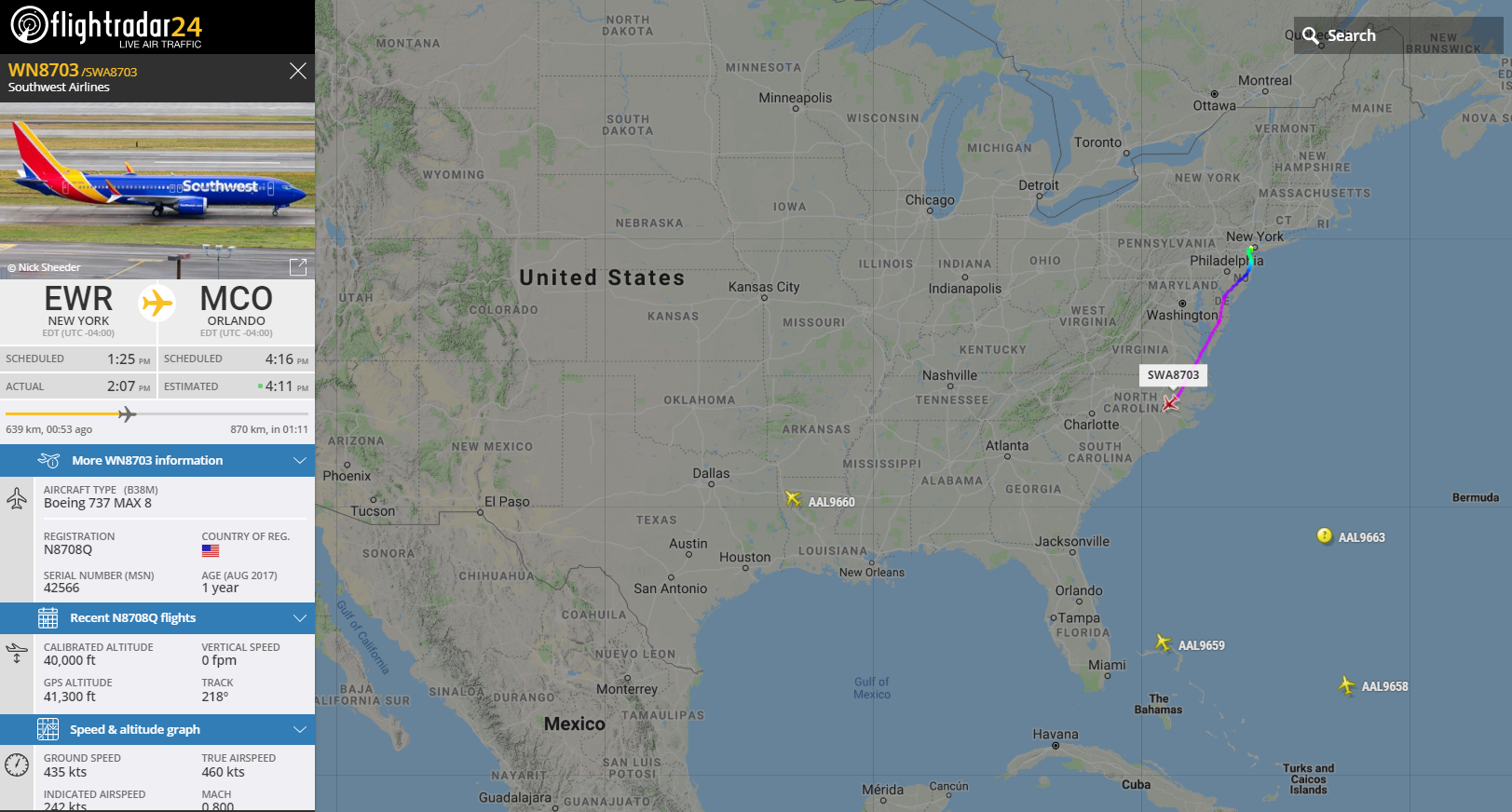 Midday Thursday, one of Southwest's 737 MAX was in the air -- positioning from Newark (EWR) to Orlando (MCO), without passengers.