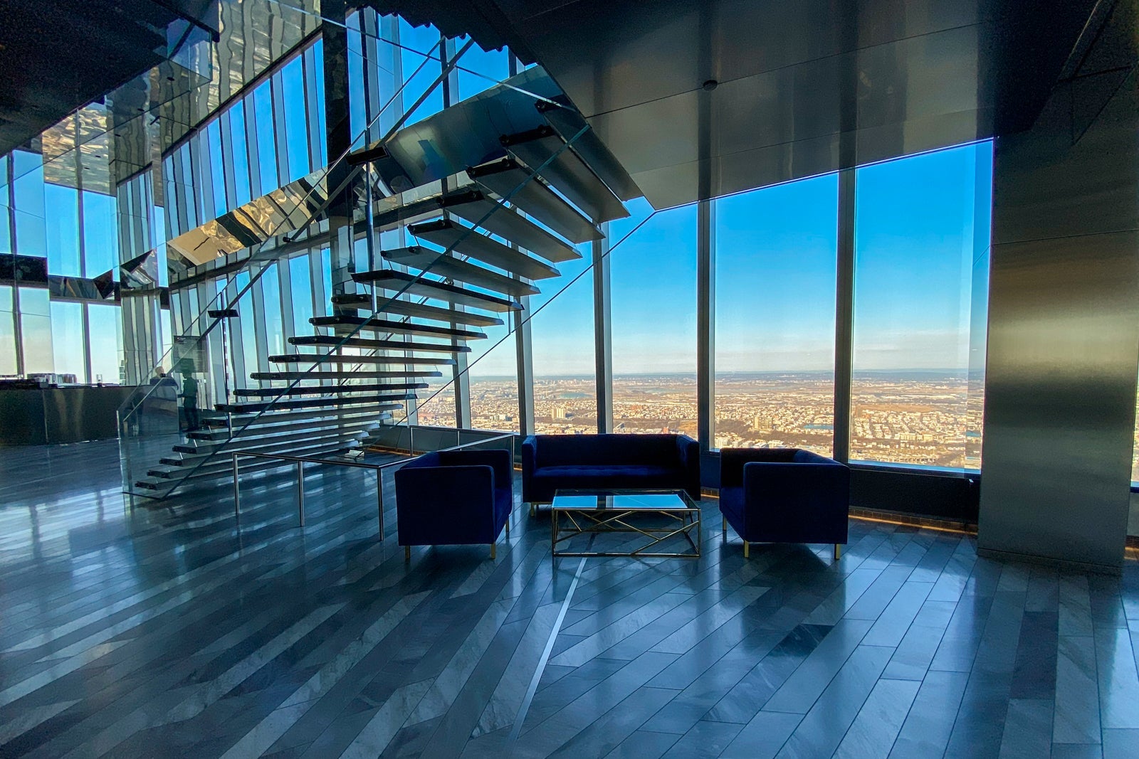An expansive interior space, crafted by Rockwell Group, features neutral marbles and metals that appear to change color as the lighting evolves throughout the day. A dramatic staircase with steps that seem to float takes you to the 101st-floor restaurant, Peak.