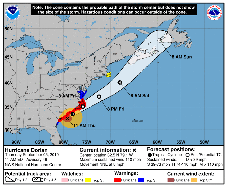Although forecasts originally showed the center of the hurricane staying offshore, the current forecast is for the hurricane to make landfall on the Carolina coast on Thursday or Friday.