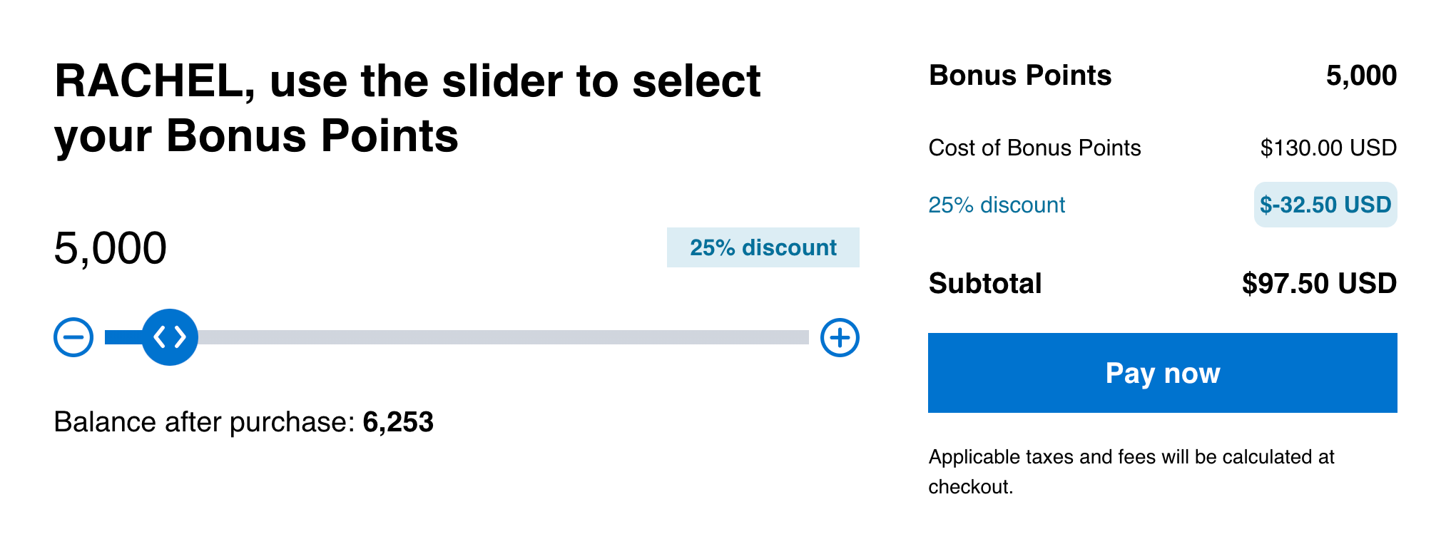 - Select the number of points you want to purchase (there's a minimum of 5,000 to get the discount), then click "Pay now" and follow the steps to complete your purchase.