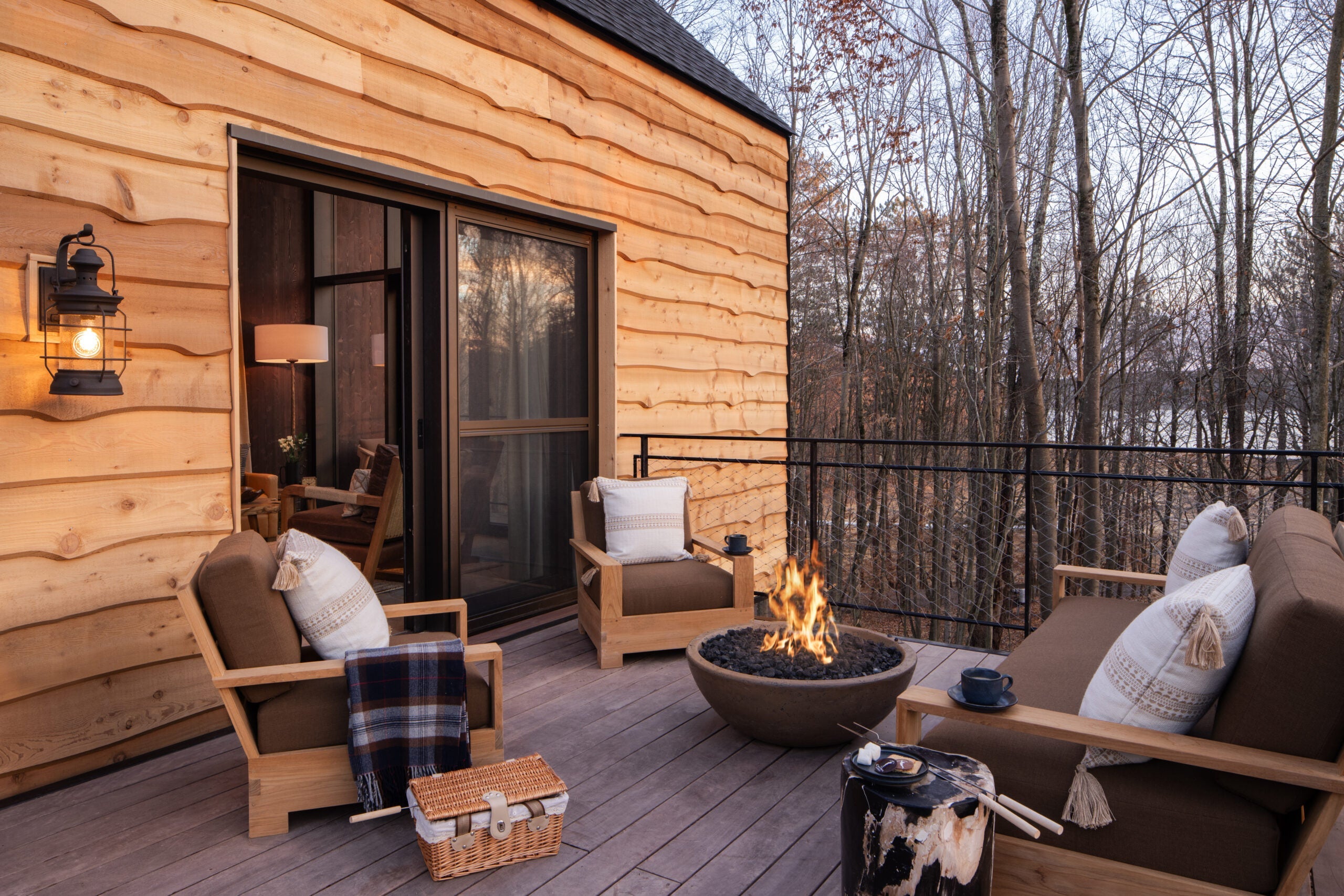 The Chatwal Lodge's treehouses are a long way from what some of us may remember camping out in during childhood: Each 1,300-square-foot treehouse can sleep up to four guests and comes with a king-size bed on the main level, a loft with a queen-size Murphy bed, a living room with a wet bar and a covered balcony and exterior deck with a gas-powered fire pit. Bathrooms feature heated floors and Malin & Goetz products.