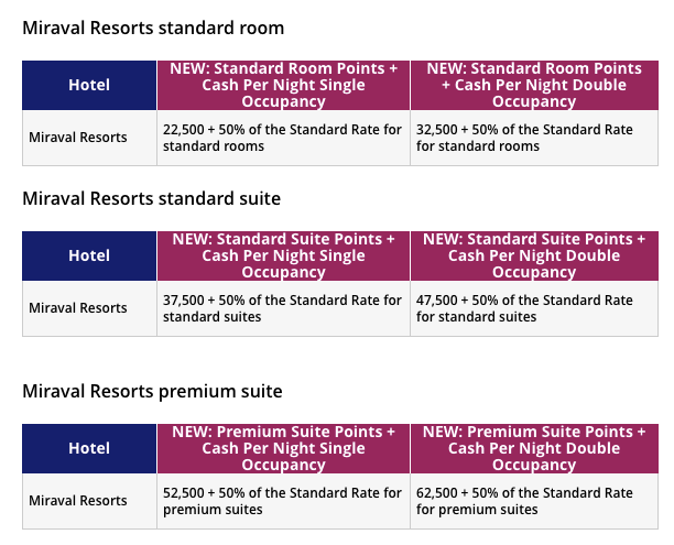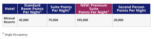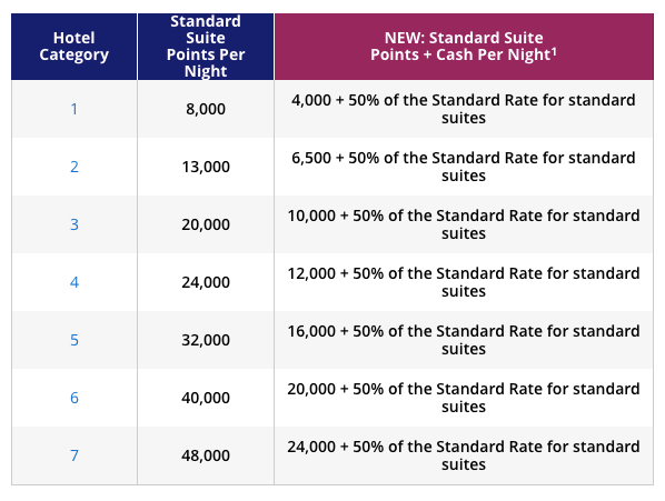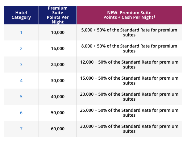 The expansion of Points + Cash redemptions continues with standard suites, premium suites and Miraval Resorts all becoming available on November 1. Here's the award chart for standard suite Points + Cash nights: