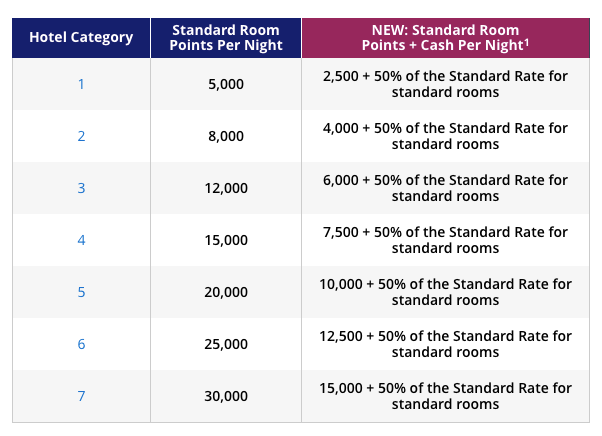 Also beginning on November 1, the cash surcharge on Points + Cash nights will become 50% of the standard room rate instead of a flat amount, in addition to a set amount of points by property category. You will also be able to get Points + Cash awards for standard rooms at MGM properties in Las Vegas and Hyatt Residence Club resorts, which was previously not a possibility. Here is the new Points + Cash chart: