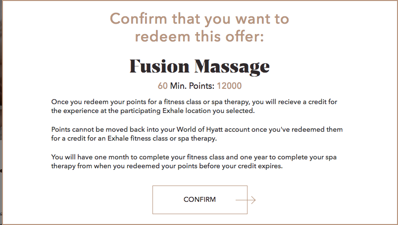 I looked at the cost of classes and spa treatments at the varying locations. A single fitness class goes for $22 in Atlanta and $37 at the varying New York locations. At 2,000 points per class, this gives you a value of between 1.1 and 1.85 cents per point, depending on the spa location you visit. For massages, most of the 60-minute sessions you can book with 12,000 points go for $155 online when booking on Exhale's website. This gives you a value of 1.3 cents per point, and bear in mind that you're still responsible for customary gratuity out-of-pocket. These aren't great value for Hyatt points (TPG valued them at 1.8 cents apiece in his most recent valuations), but they aren't too bad. A fitness class in New York for 2,000 points could be a steal, and if you're absolutely swimming in Hyatt points with no immediate need, why not pamper you or a loved one with a treatment?