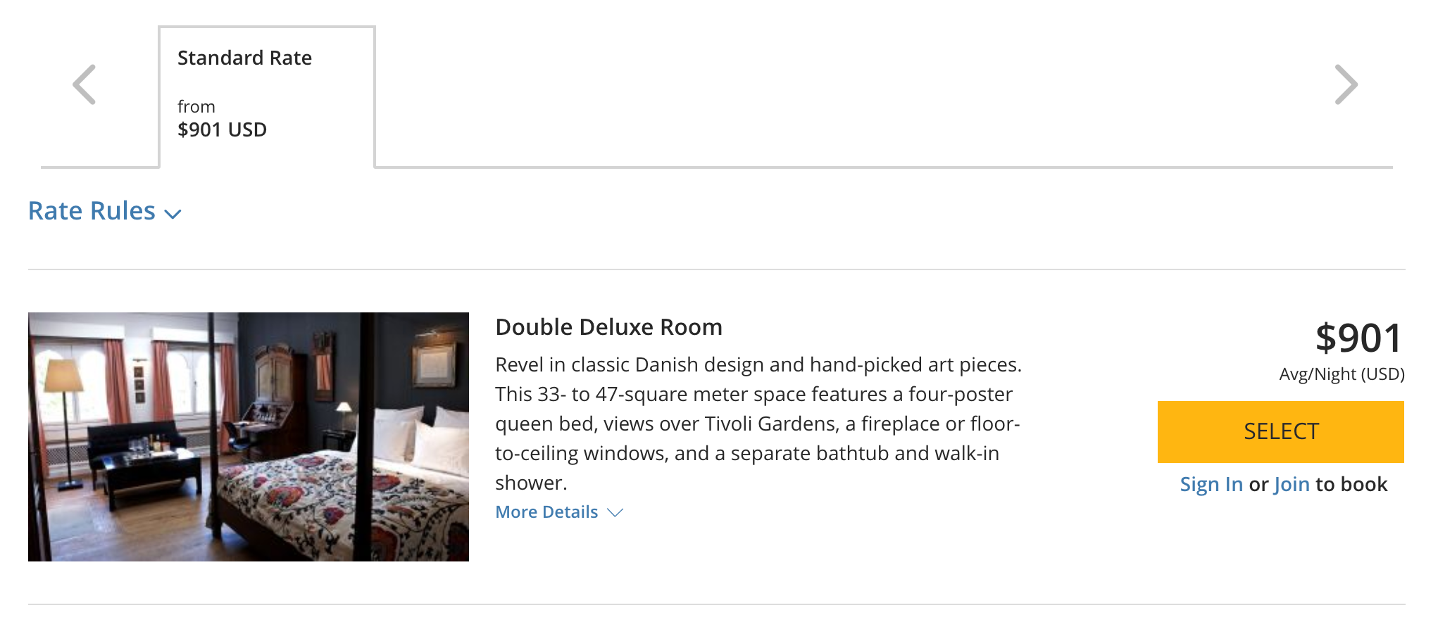 All of these properties have also been assigned to the World of Hyatt award chart, and it appears that six do fall into the relatively new Category 8, requiring 40,000 points per night. However, this still can represent a fantastic redemption. An an example, the Nimb Hotel offers standard rooms that range from 33 to 47 square feet and overlook Tivoli Gardens. We see many summer dates with paid rates of over $900 per night: