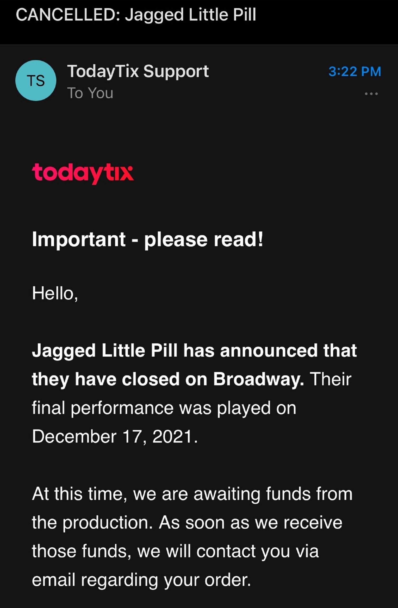 I booked my tickets through the TodayTix app, and the funds were automatically processed in the form of a TodayTix credit that I can use to rebook for a later date or to buy tickets to other shows.