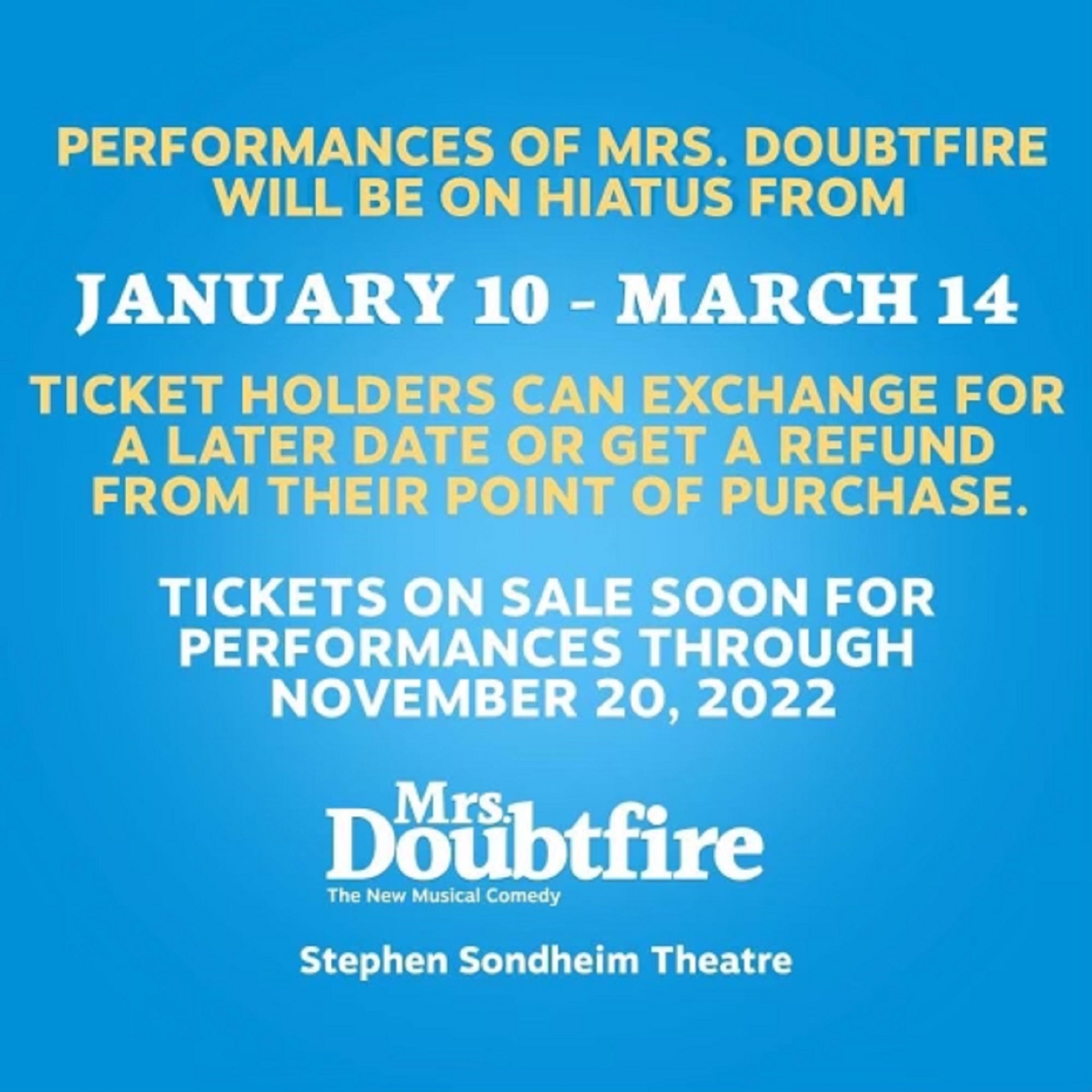 - "Mrs. Doubtfire" (resumes March 14)