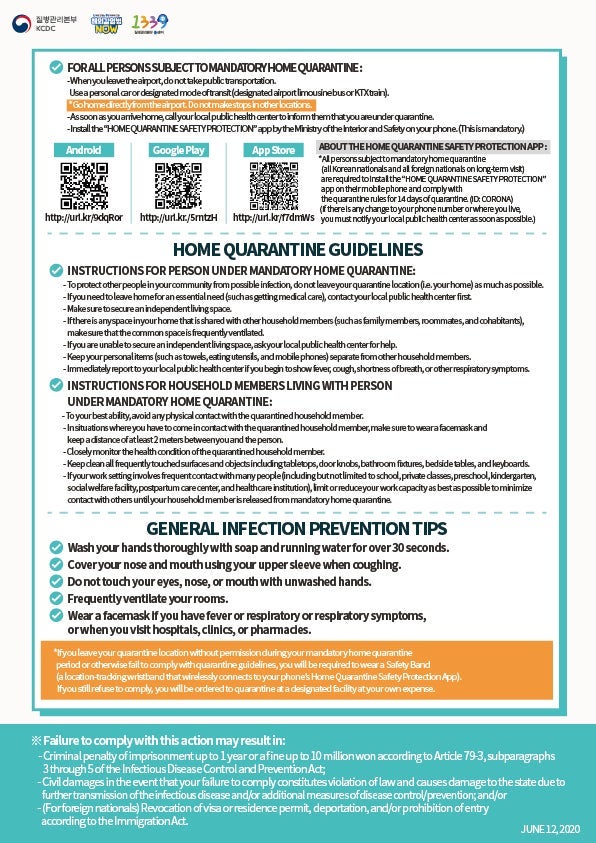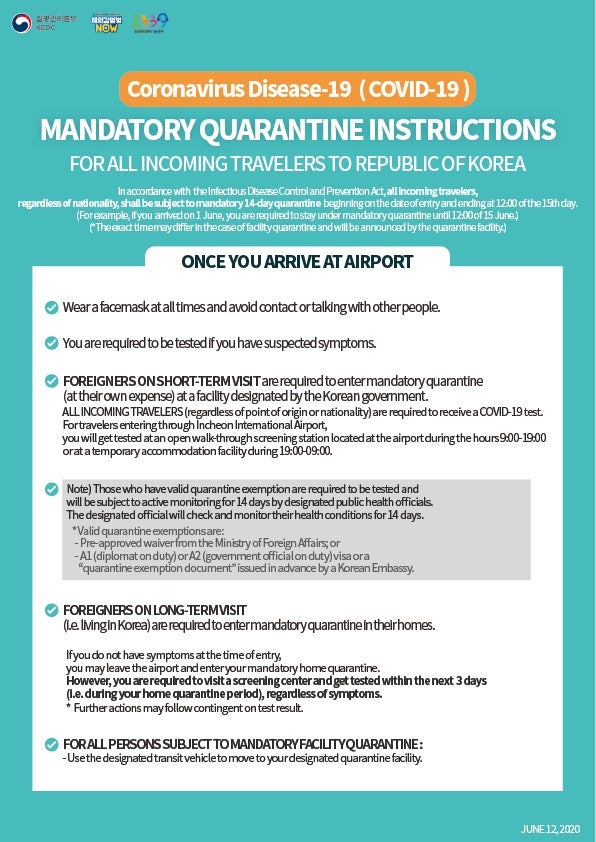 - Assuming that you are considered non-symptomatic, you proceed to stands (depending on your legal status in Korea) where a soldier of the Korean Army will check for your self-quarantine eligibility. For most foreigners without a specific visa, you will get documentation for the mandatory 14-day government quarantine; if you disagree to any portions of the government quarantine, you may be asked to leave the country. App status may be checked again in this stage.