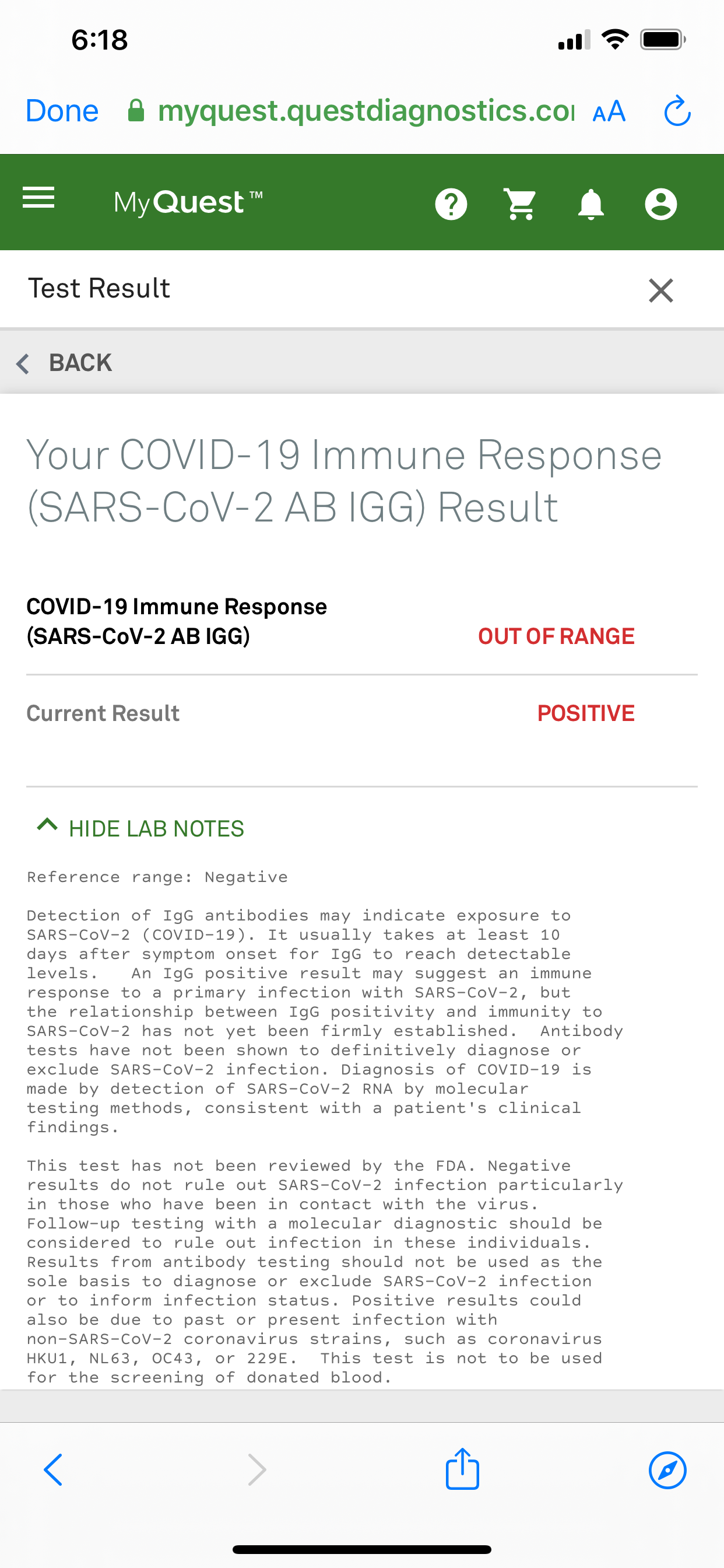 In no uncertain terms, the test was telling me I had had COVID-19 and potentially still do, though I find that hard to believe since I've been in near-isolation in a rural area with no symptoms for almost seven weeks now. I had no major symptoms. I maybe had a little scratchy throat and some minor stomach issues after I left New York, but I thought it was more my life in the woods and changing to a normal routine and certainly nothing out of the ordinary.