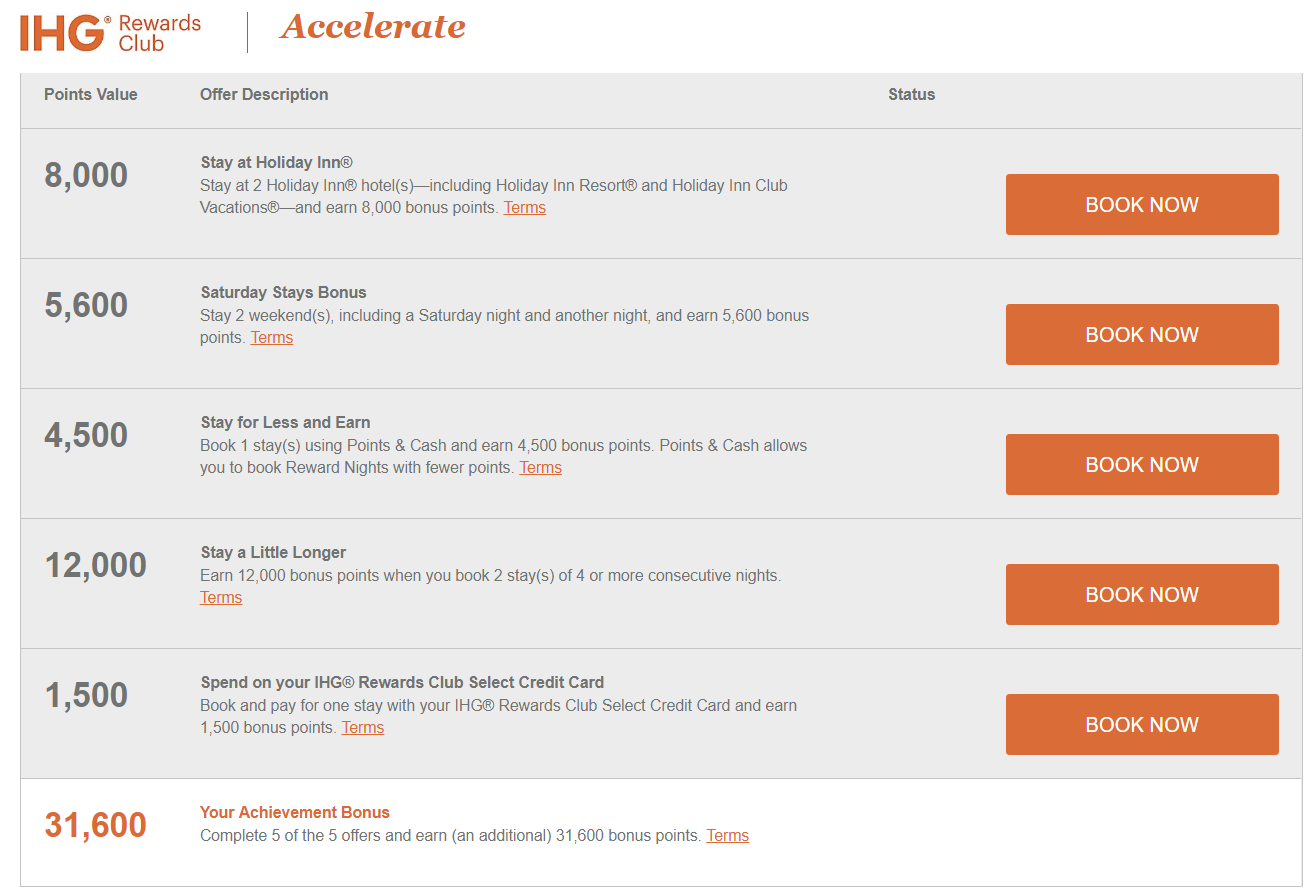 - Stay at Holiday Inn -- Stay at 2 Holiday Inn hotels -- including Holiday Inn Resort and Holiday Inn Club Vacations -- and earn 8,000 bonus points.