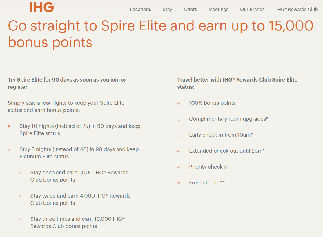 You'll also earn 1,000 bonus IHG points for completing your first stay, another 4,000 bonus points after the second stay and 10,000 more bonus points for completing a third stay. That's a total of 15,000 bonus points from this offer -- which is worth $75 based on current TPG valuations. Plus, you'll earn even more points from these stays, as Spire Elite status earns 100% bonus points over the base earning rate for general members.