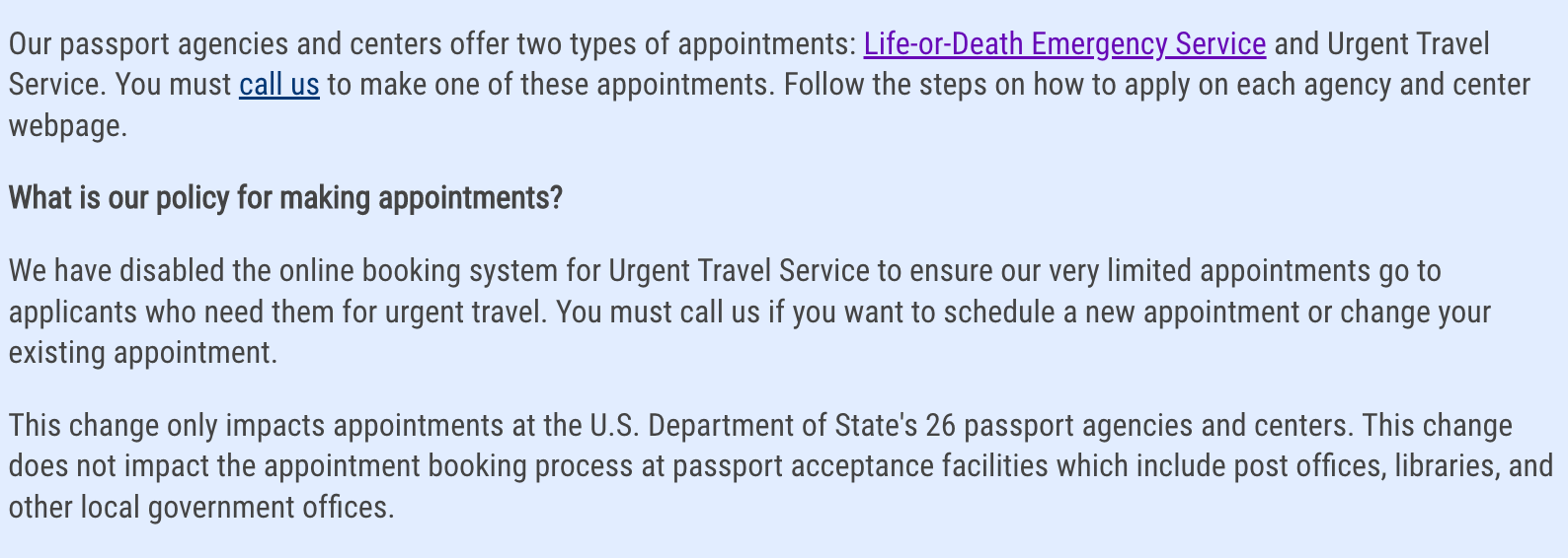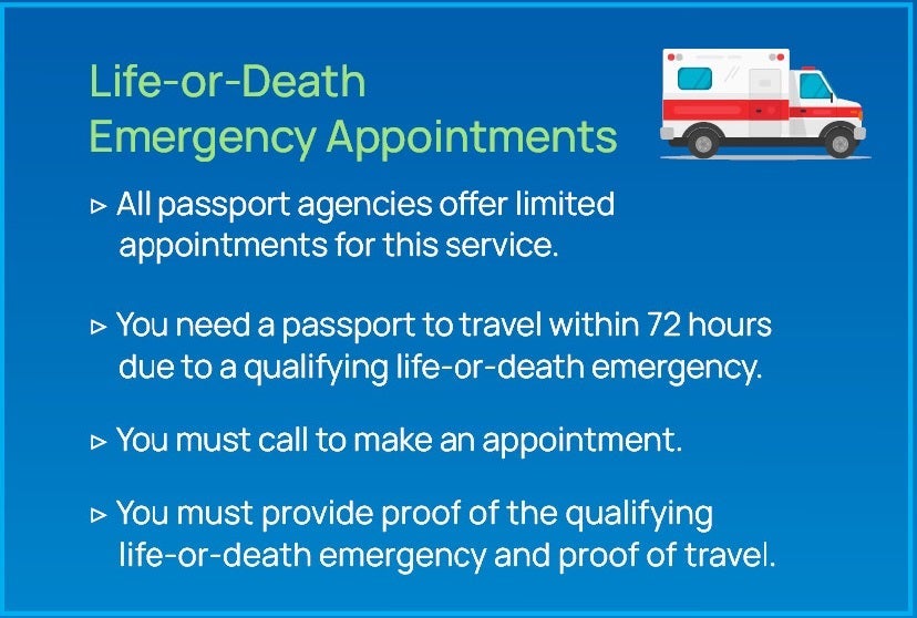 Another limited option for travelers who fall under very specific circumstances for both emergency and non-emergency travel is to book an urgent appointment at one of 26 passport agencies and centers.