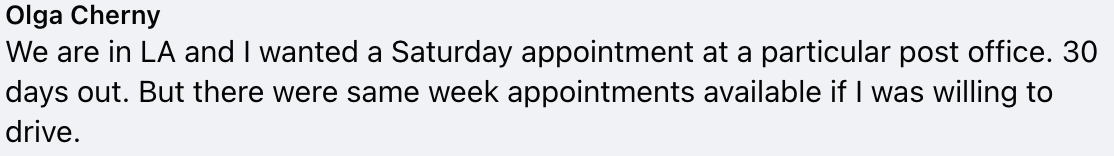 The situation is slightly better throughout other major cities but still not great. The first available appointment at five of the six USPS locations in Austin is June 14; the same is true for all Houston-area locations.
