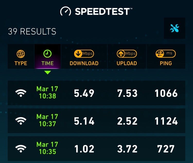 Using the SpeedTest App, I clocked the download speed between 5-6 Mbps over multiple tests I performed. That's sufficient enough for most tasks you'd want to perform on a plane. Upload speeds were great as well, from 2.5 to 7.5 Mbps. Others in the group were able to successfully access and communicate through Snapchat Live and Periscope. One colleague was broadcasting on Periscope, but when I tried to watch the life feed, it wouldn't come up on my phone.
