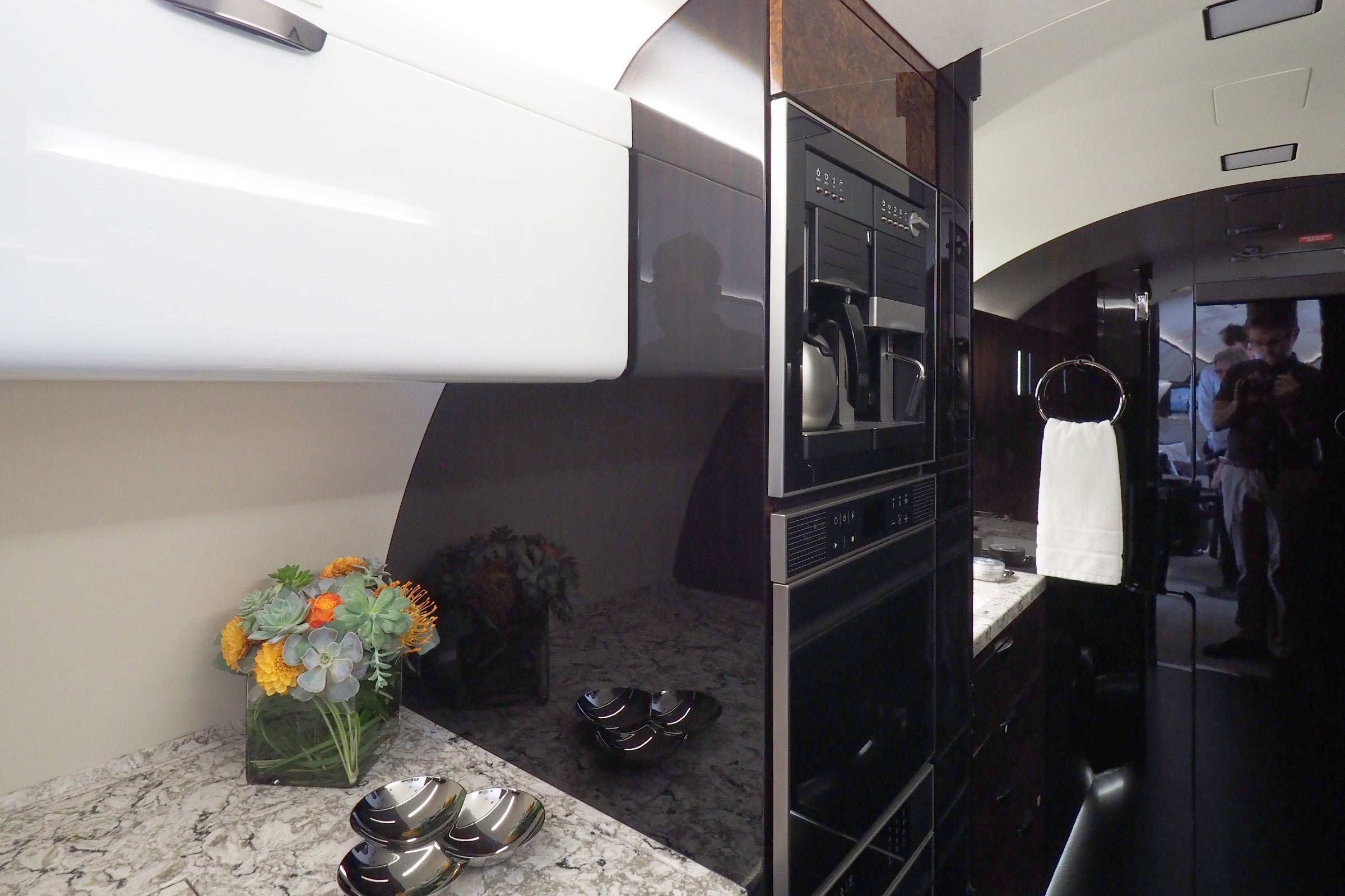 The crew areas are almost as attractive as the passenger cabin behind — the G500 has one of the nicest galleys I've seen on a plane.