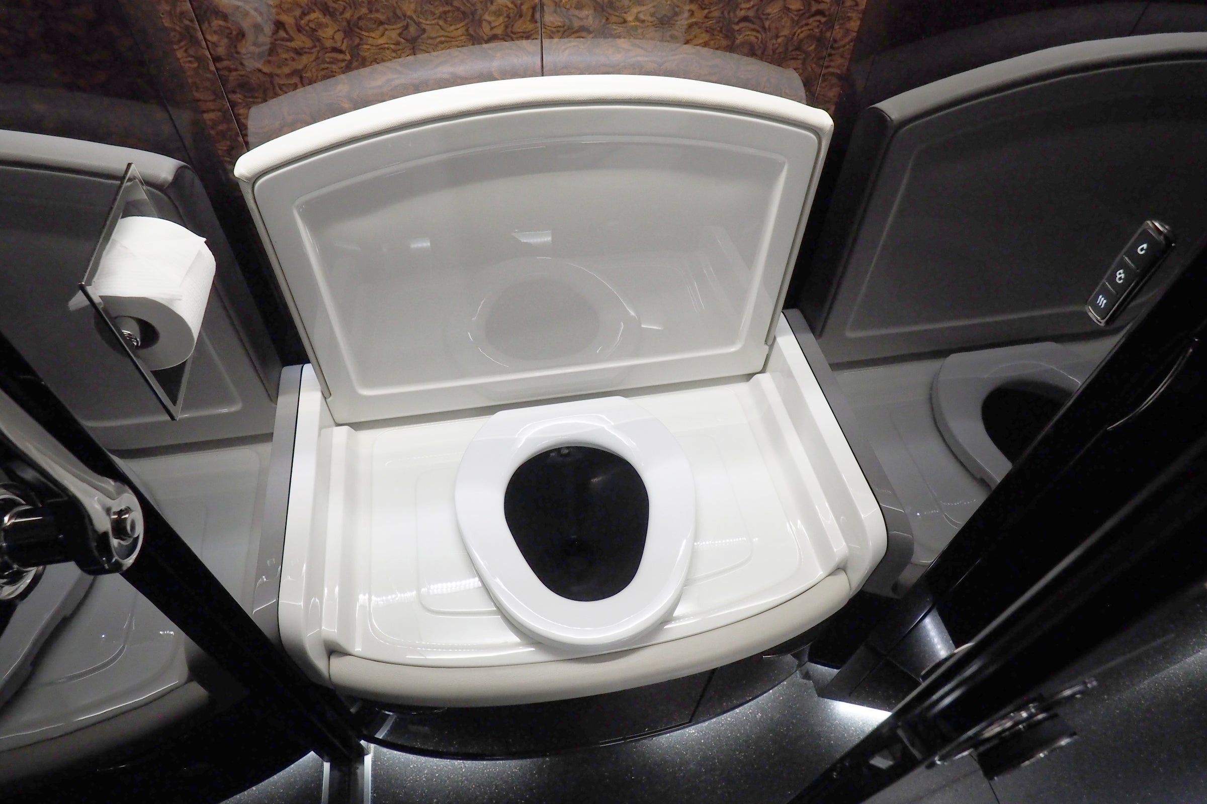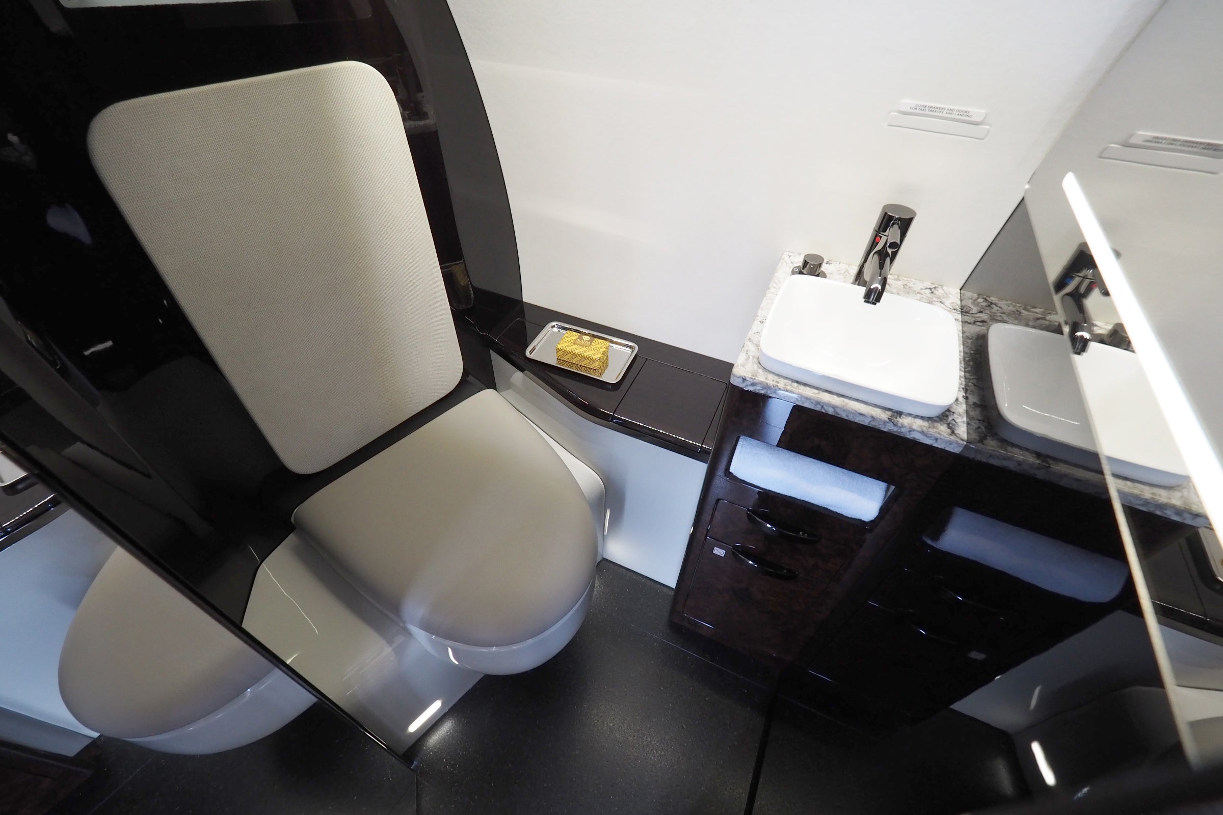 While it's not gigantic, this is one of the highest-end lavs I've seen — the toilet even disappears entirely, hidden beneath a leather seat.