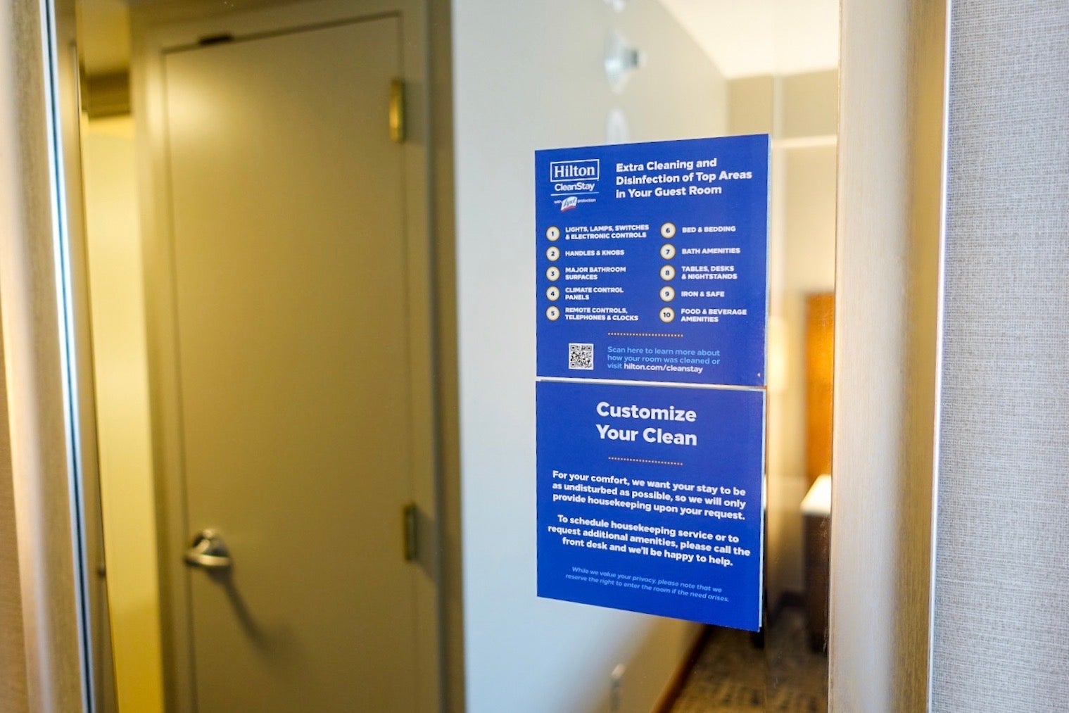 There were multiple stickers in the room outlining the extra cleaning steps. As with most other signage throughout the hotel, there were also QR codes that linked to more information about the updated protocols.