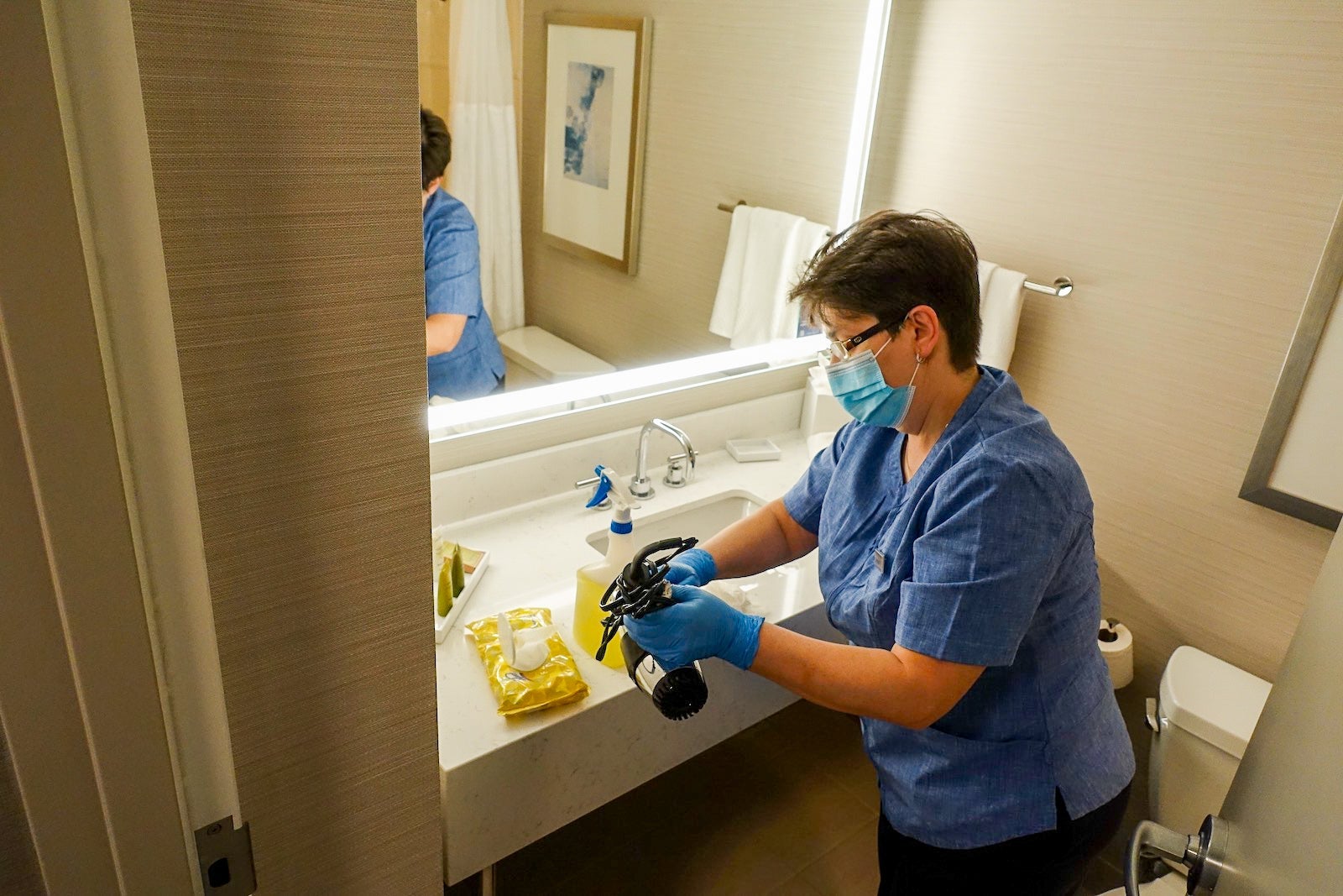 The deep cleaning was a two-stage process. Everything was sprayed with a disinfectant and wiped down with Lysol disinfecting wipes, which have been approved by the EPA to kill the novel coronavirus, SARS-CoV-2. The room smelled clean, without an overpowering chemical odor.