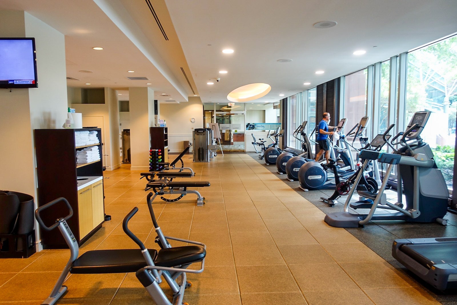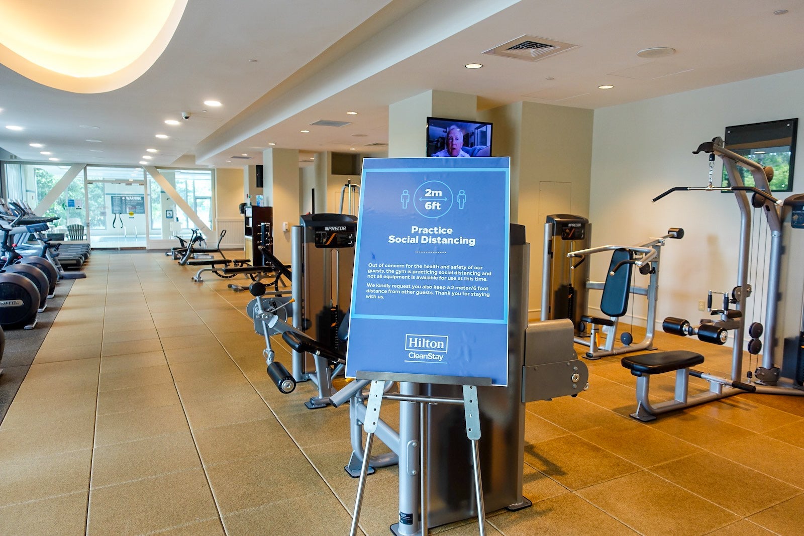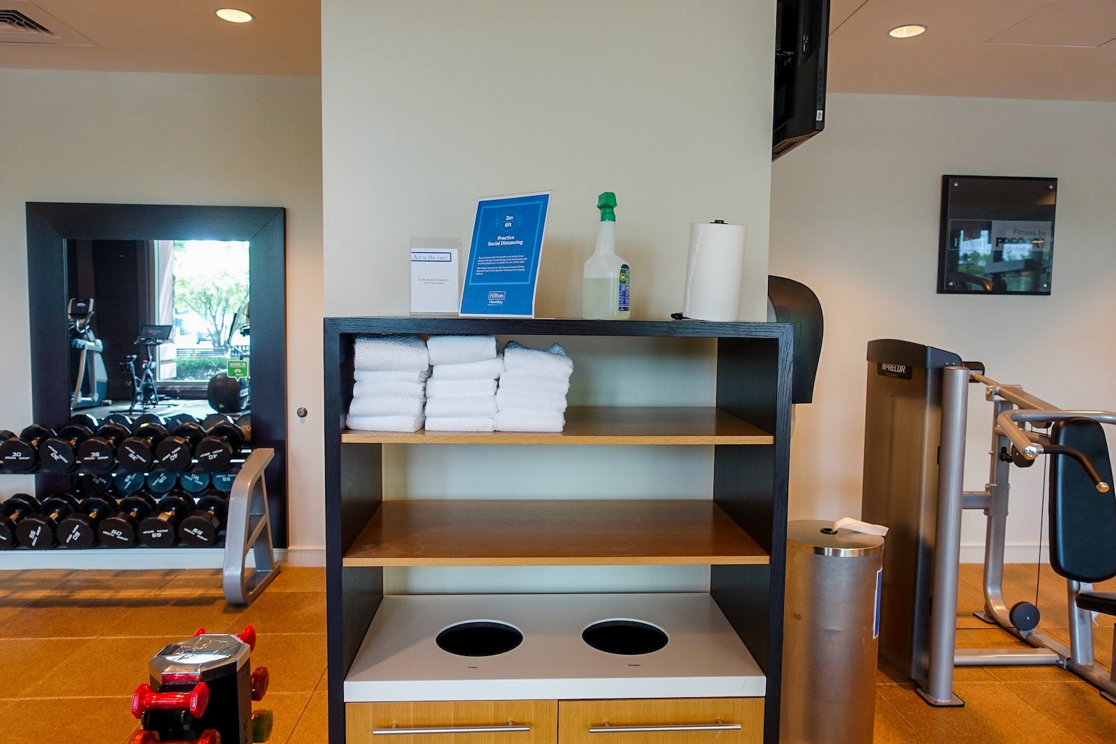 Again, there were signs reminding guests to practice social distancing. There were also disinfectant wipes and other cleaning supplies for guests to wipe down equipment before and after use. Towels were still available.