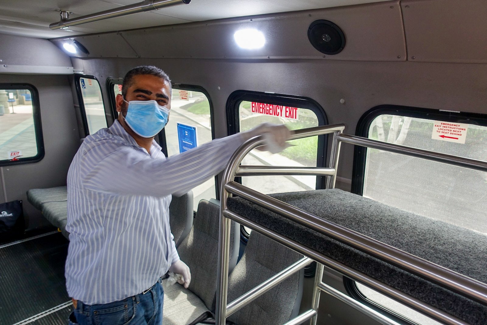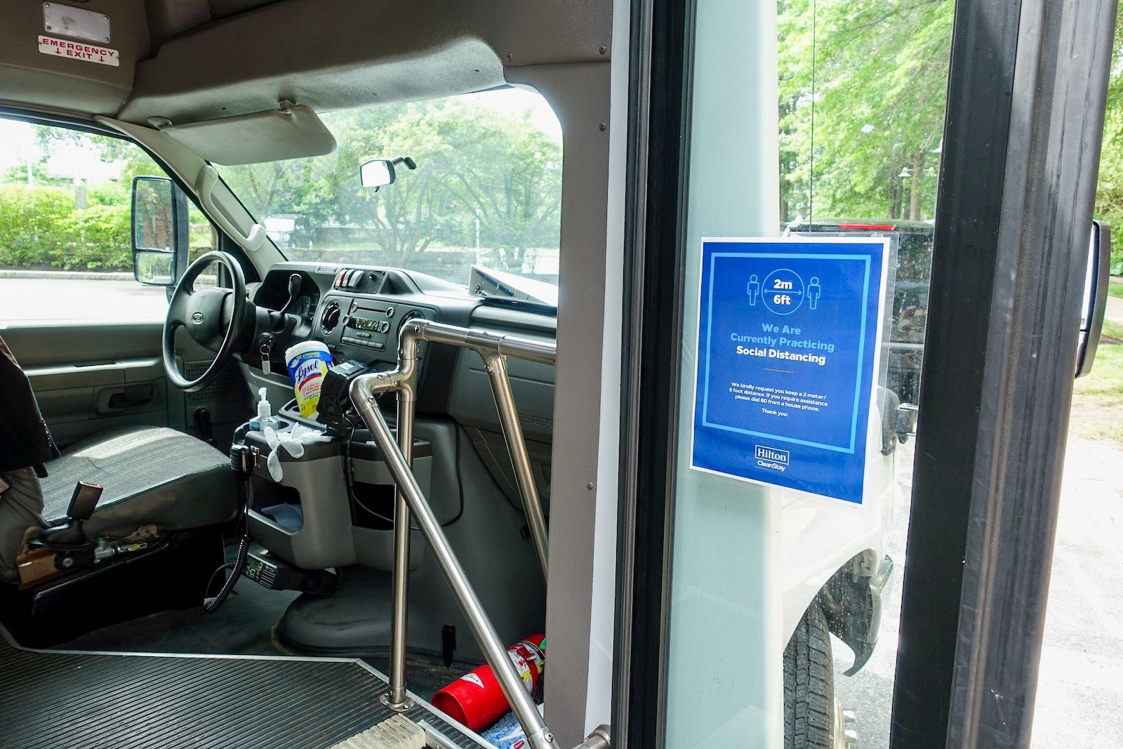 The hotel's airport shuttle bus had signs about social distancing and capacity could be limited. It was also equipped with hand sanitizer and disinfectant wipes for the driver to wipe down touchpoints between rides.