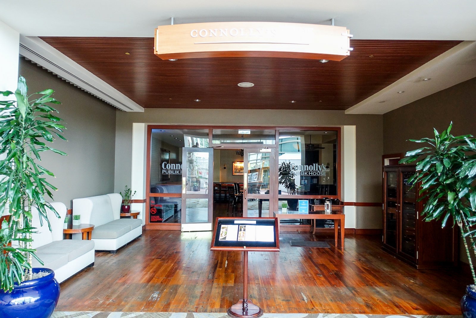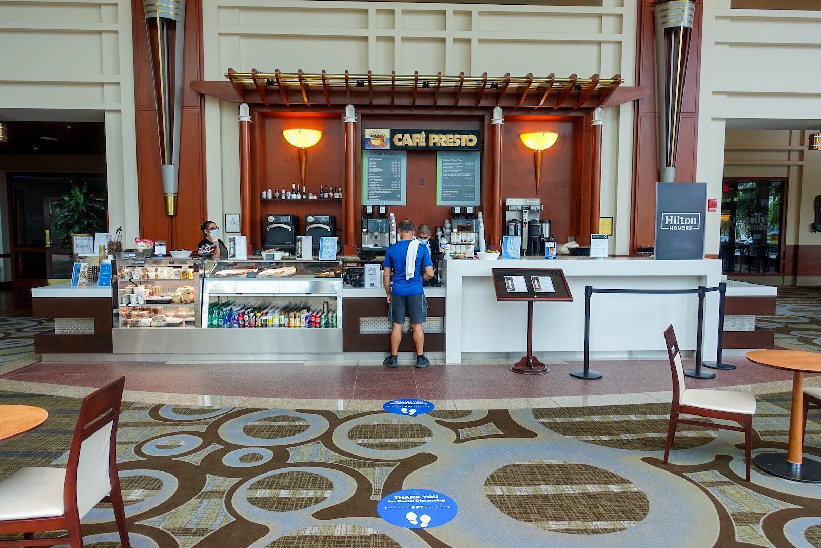 At this property, food was only available to-go. Sit-down dining and room service were not available. Yet again, there were signs reminding guests about face coverings and floor markers for distancing.