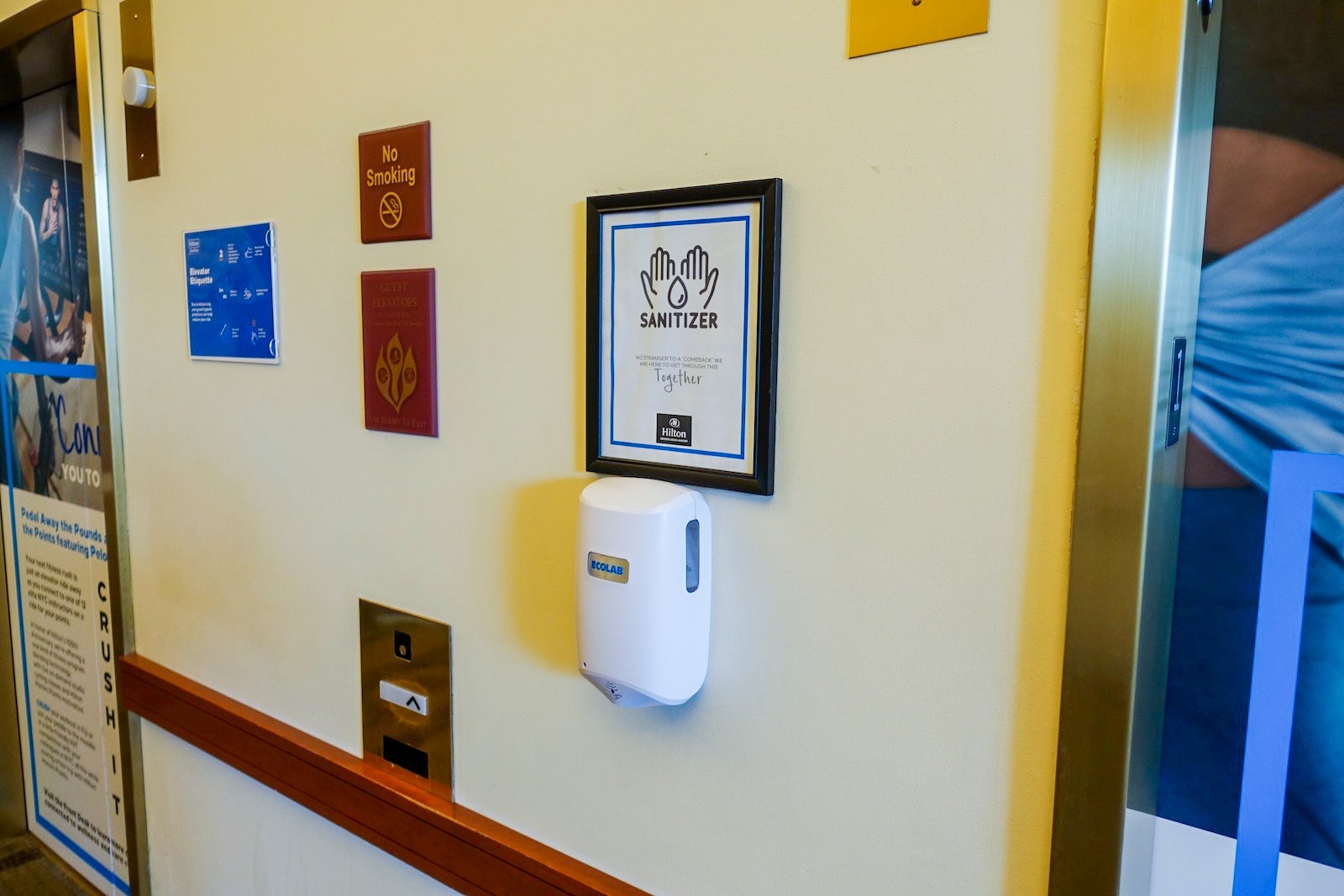 High-traffic areas like the elevator bank had stations with hand sanitizer and disinfecting wipes. Additionally, there were "elevator etiquette" signs reminding guests of social distancing and good hygiene practices.