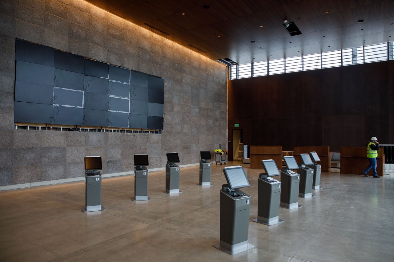 The airline counters will feature countertops to be installed soon with marble sourced from Italy.