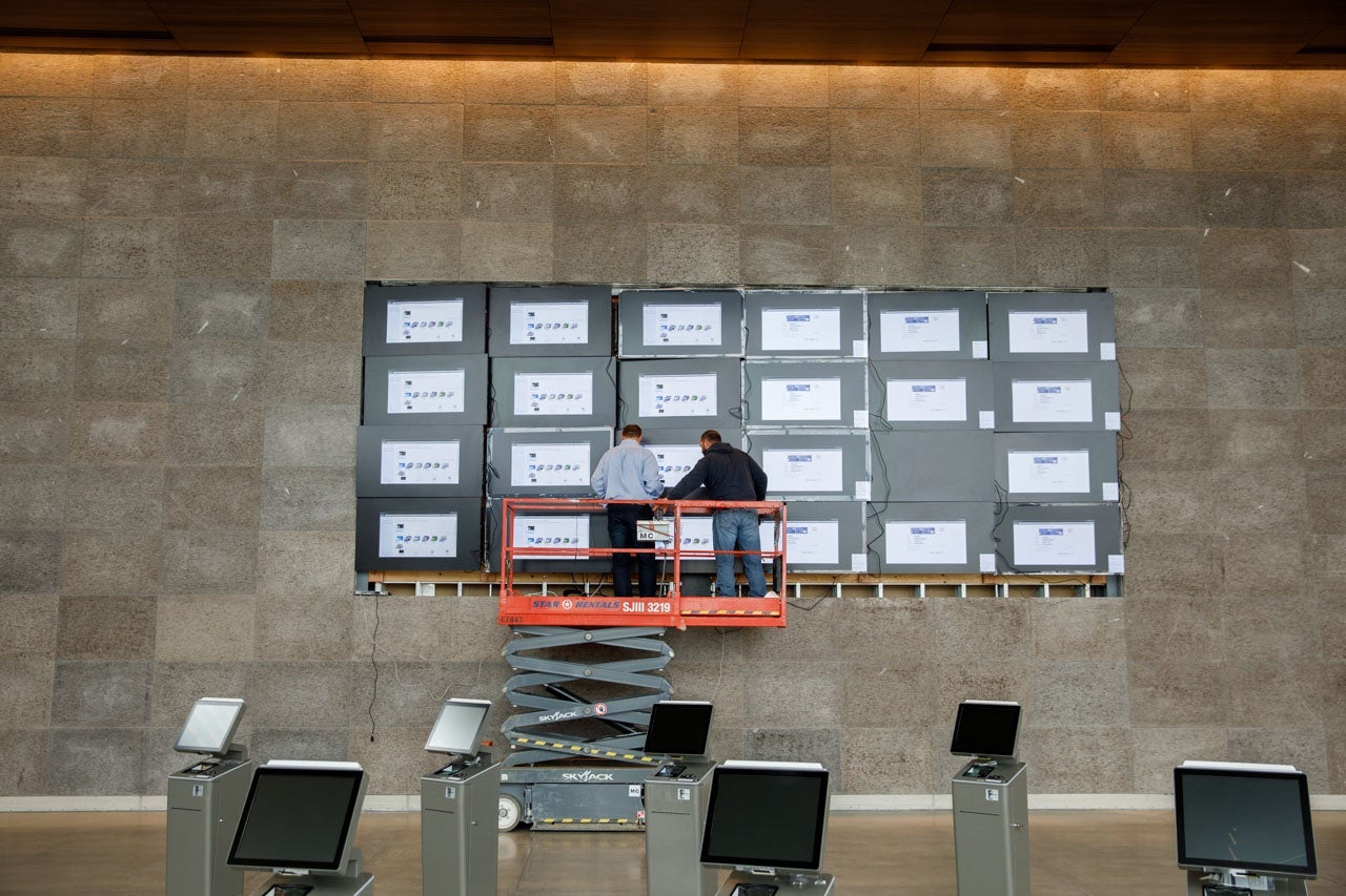 The main flight display board was still being installed when I visited. It will be programmed to resemble the classic split-flap Solari boards.