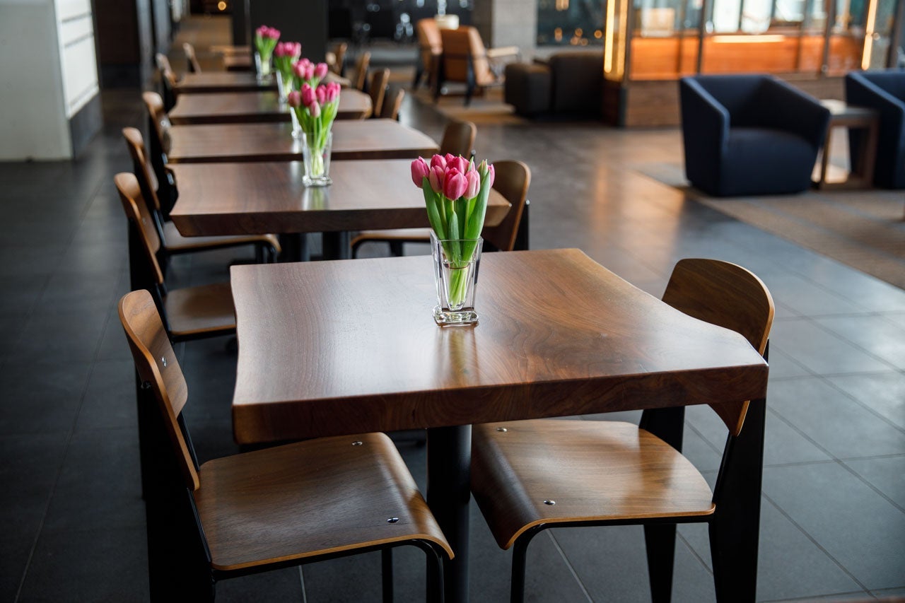 Orchids stood on some of the tables along with reading material. Additional small tables may be installed in some seating areas to give passengers a place for beverages or laptops.