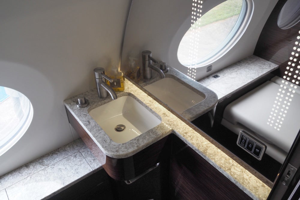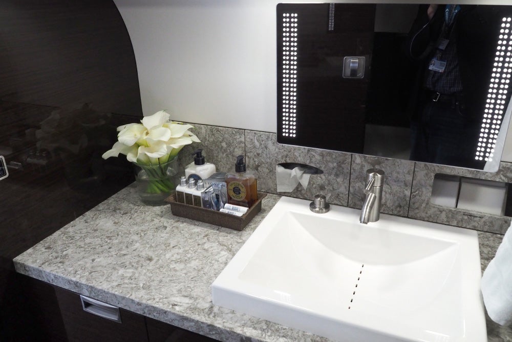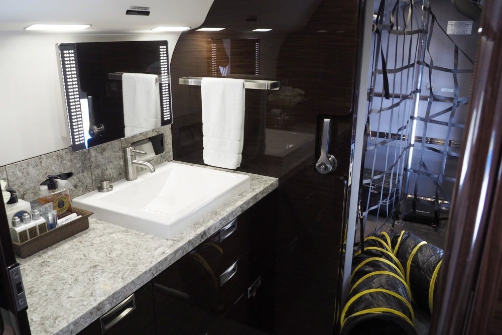 This particular configuration offers two lavatories — one up front and a second in the rear, so a VIP passenger sleeping in the closed-off compartment doesn't need to make his or her way to the front to use the bathroom. The forward lav is fairly basic.