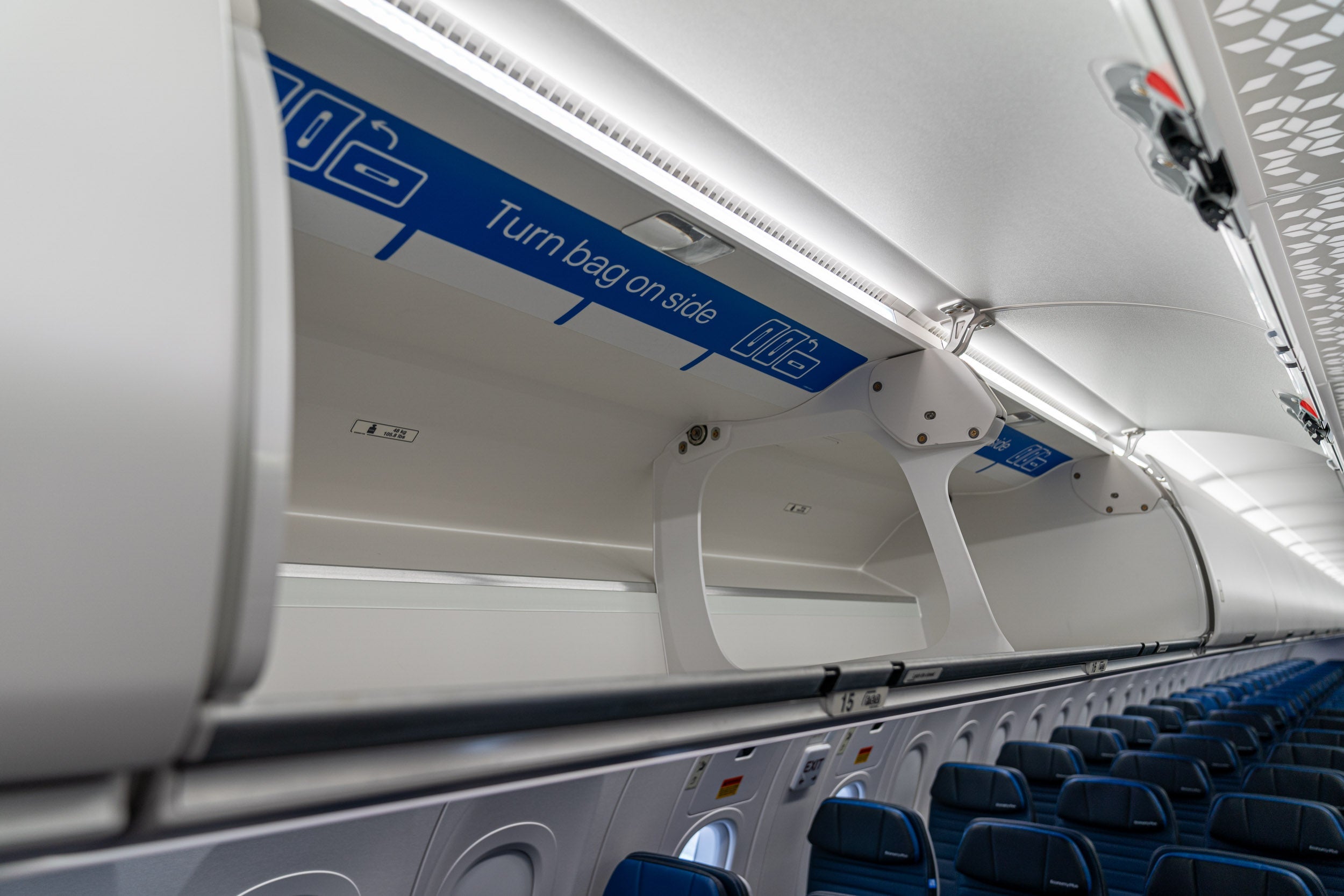 United claims the new overhead bins are large enough for every passenger to stow a carry-on bag. Anecdotally, the claim seems to be holding up on 737 MAX jets with the new interior, which is definitely good news for passengers. During TPG's tour of the new cabin, a flight attendant said that having enough stowage space for everyone fixes one of the most annoying parts of her job.