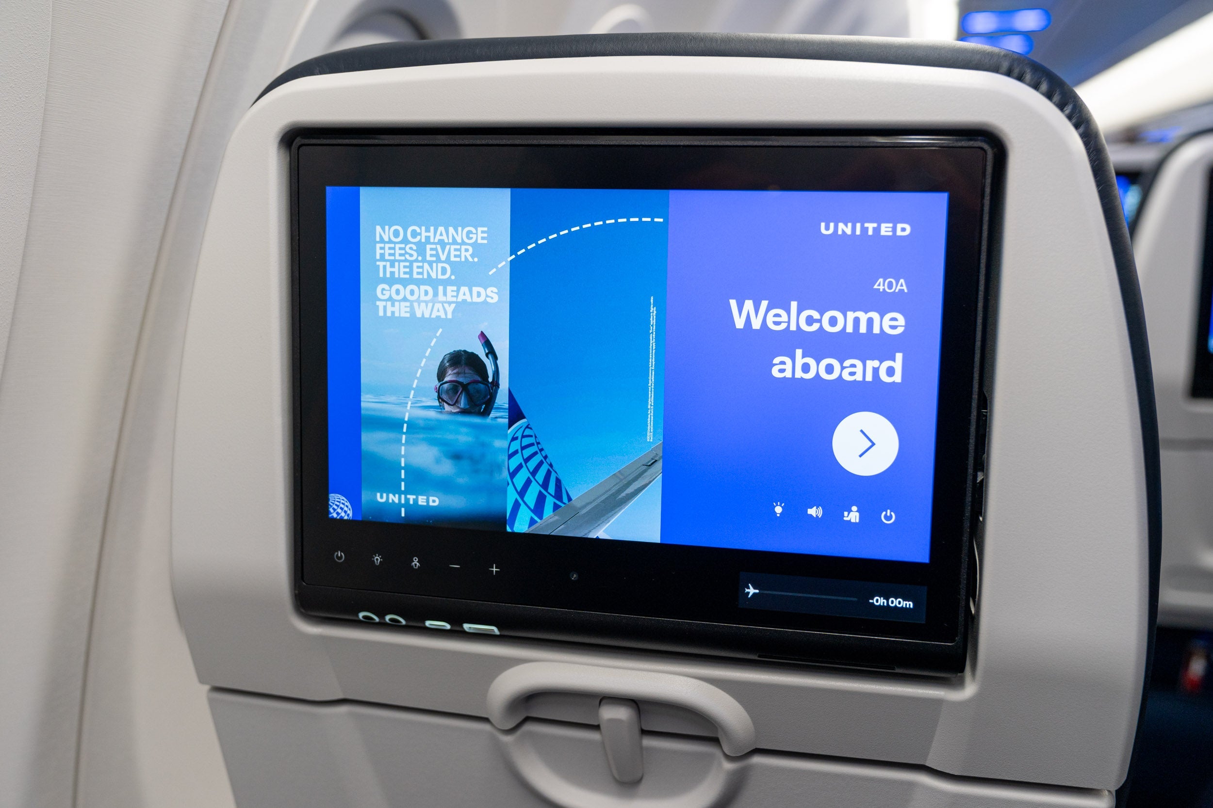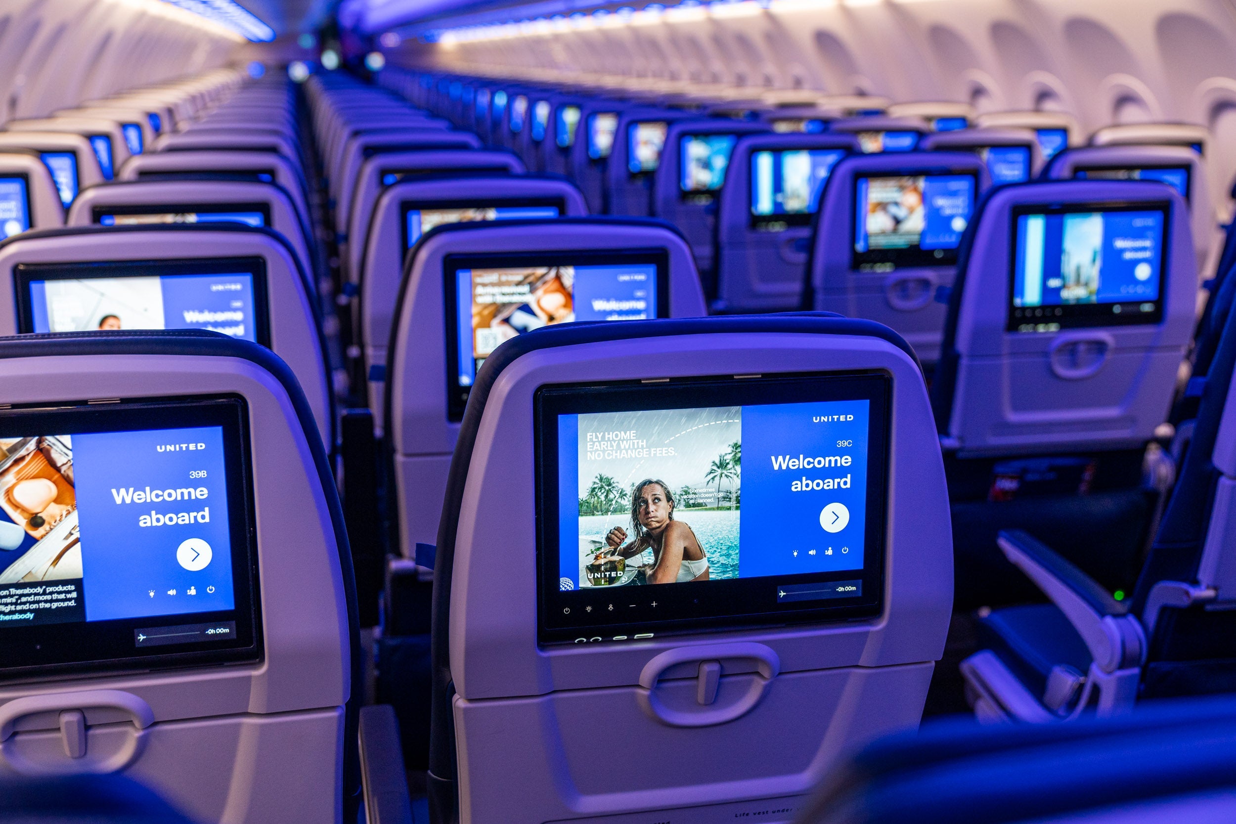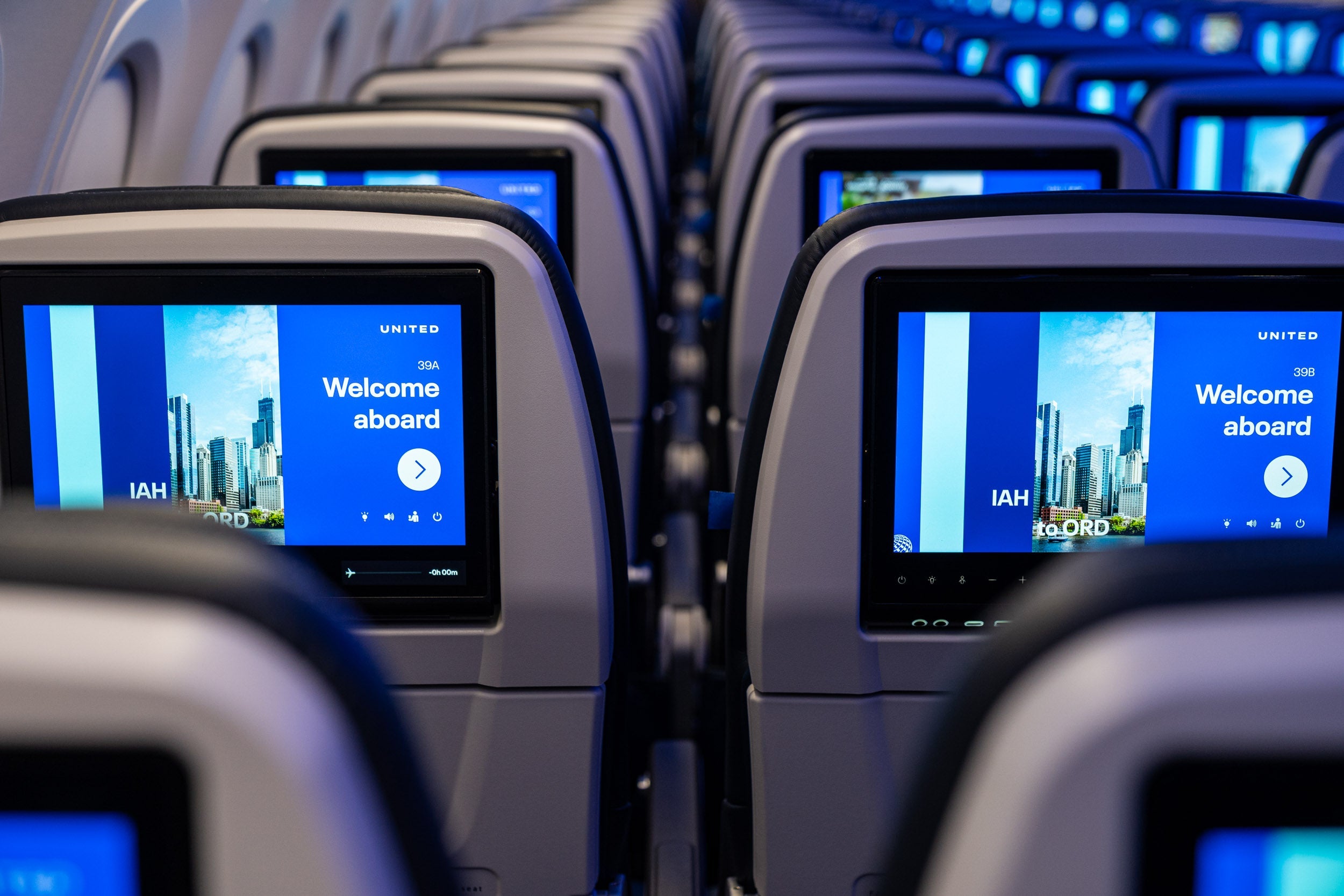 Right off the bat, the plane features the United Next interior — better cabin lighting, seatback screens with Bluetooth connectivity for headphones at every seat, larger overhead bins, power outlets, USB ports and more.