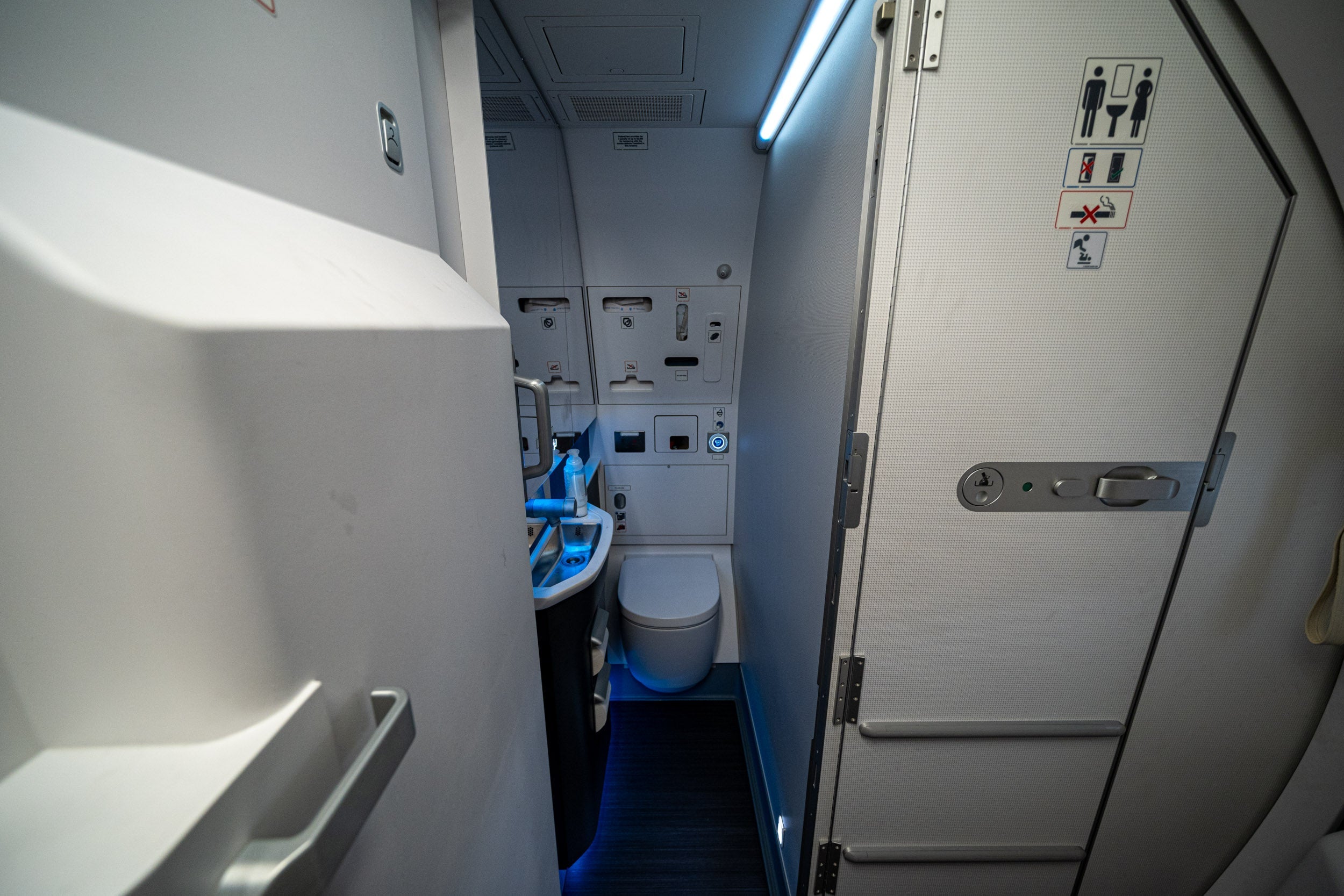There's a lavatory in between the first class and economy cabins, as well as two at the very rear of the cabin and one at the very front.