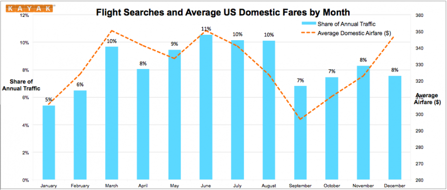 On the flip side, June was the busiest travel time with 11% of searches and airfares averaging $350, followed closely by March (also $350), July ($341) and August ($323).