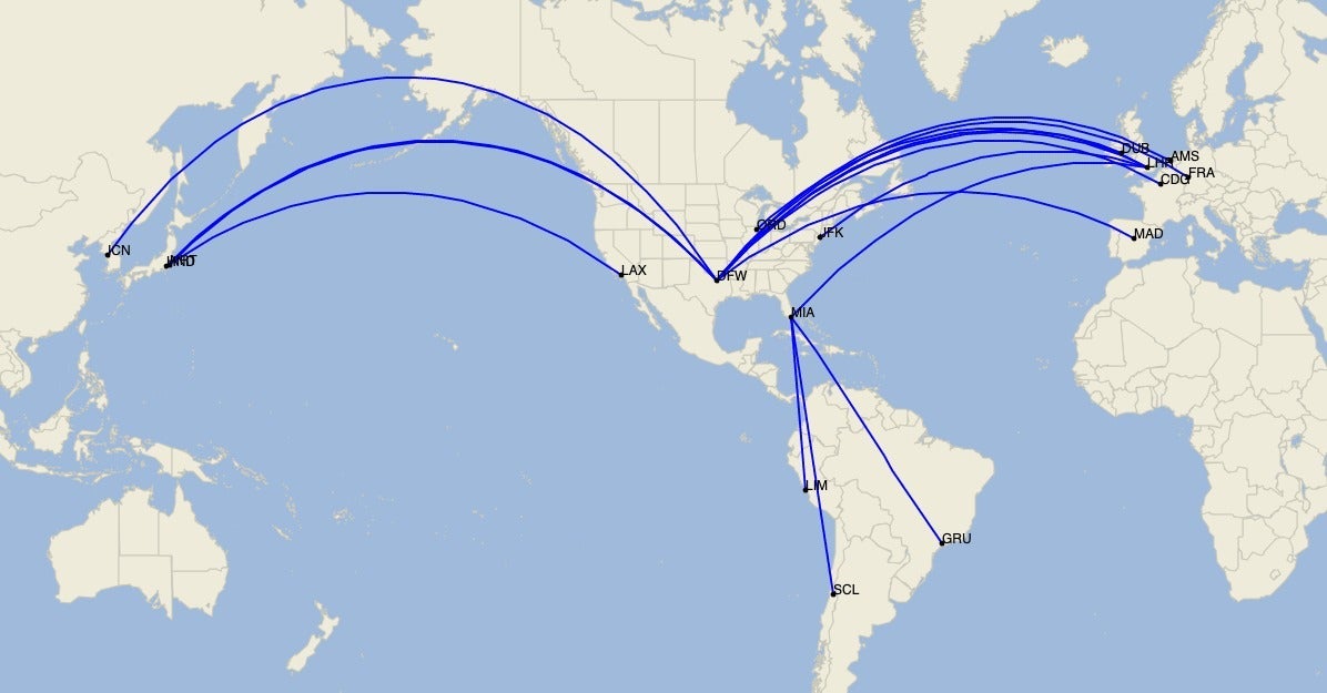 - Dallas/Fort Worth (DFW) – Amsterdam (AMS), Dublin (DUB), Frankfurt (FRA), London Heathrow, Madrid (MAD), Paris Charles de Gaulle (CDG), Seoul Incheon (ICN), Tokyo Haneda (HND) and Tokyo Narita (NRT)